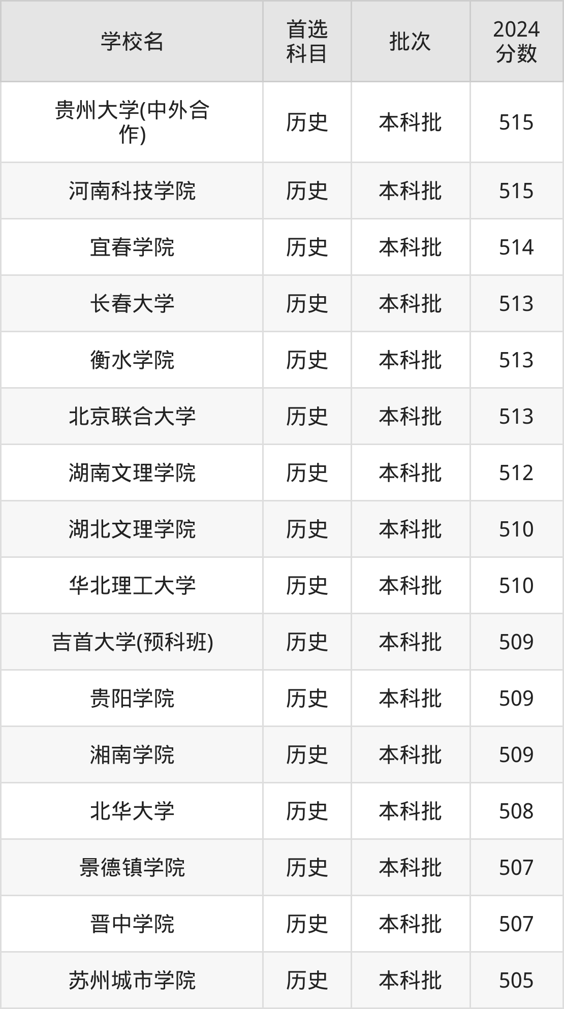首选历史科目考生能上的有16所,全部在本科批次录取。具体有:贵州大学(中外合作)(515分)、河南科技学院(515分)、宜春学院(514分)、长春大学(513分)等;