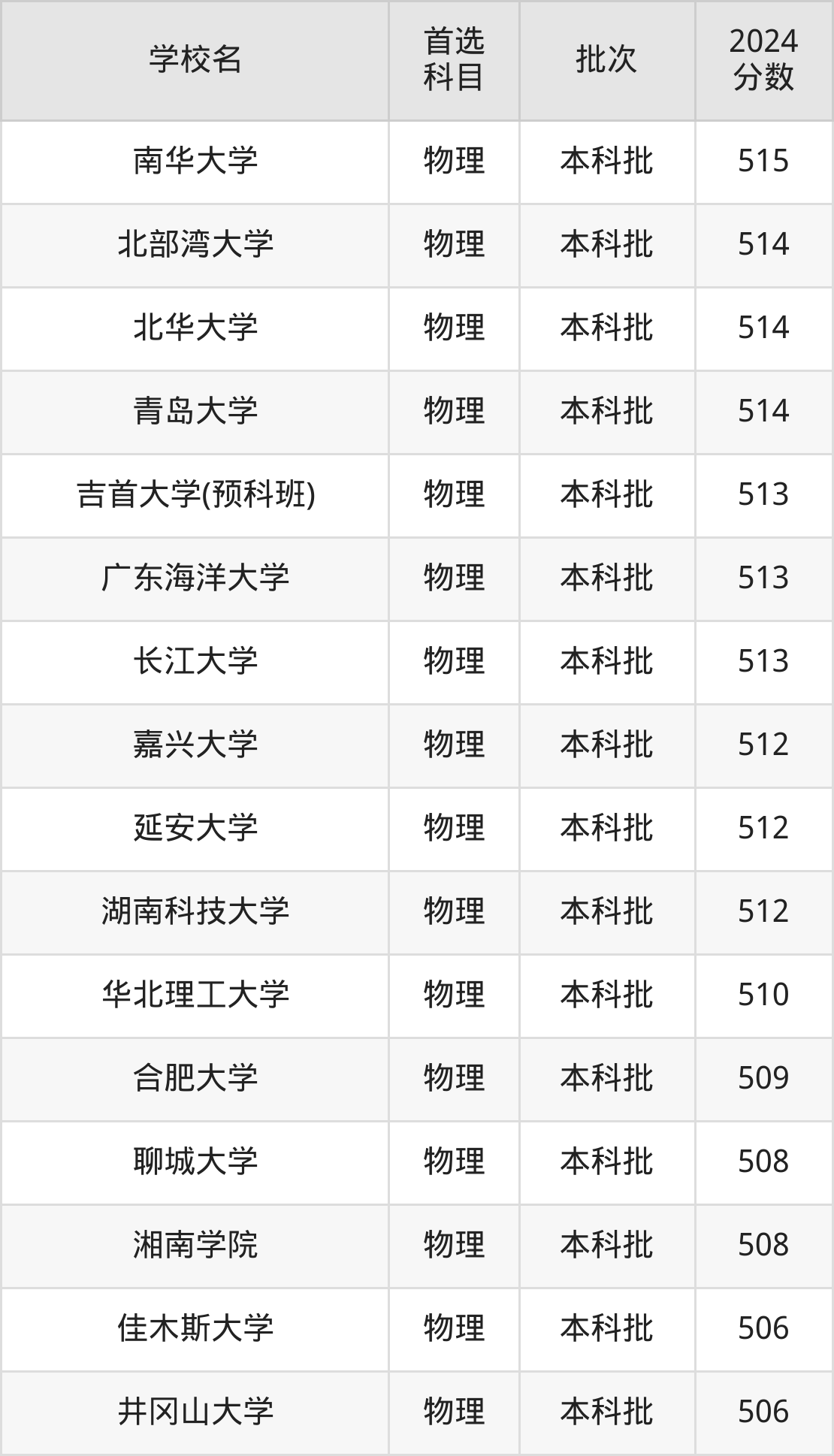 首选物理科目考生能上的有17所,全部在本科批次录取。具体有:南华大学(515分)、北部湾大学(514分)、北华大学(514分)、青岛大学(514分)等。
