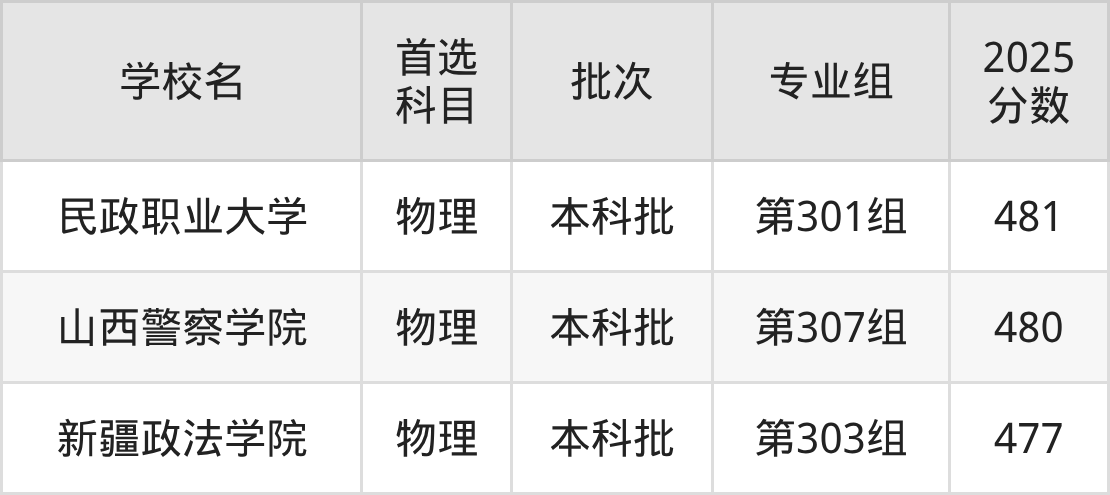首选物理科目考生能上的有3所,全部在本科批次录取。具体有:民政职业大学第301组(481分)、山西警察学院第307组(480分)、新疆政法学院第303组(477分)。