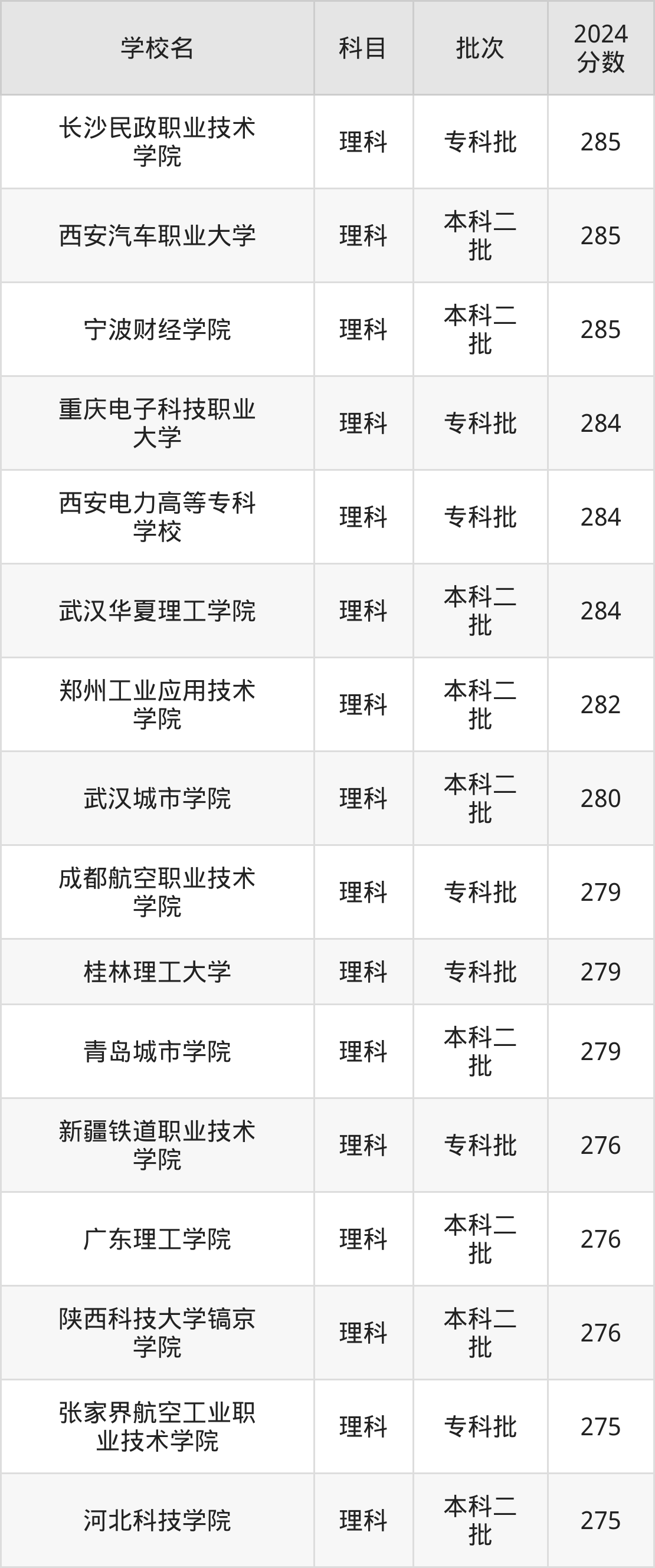 理科科目考生能上的有17所,包括12所本科医科大学和5所专科医科大学。具体有:长沙民政职业技术学院(285分)、西安汽车职业大学(285分)、宁波财经学院(285分)、重庆电子科技职业大学(284分)等;