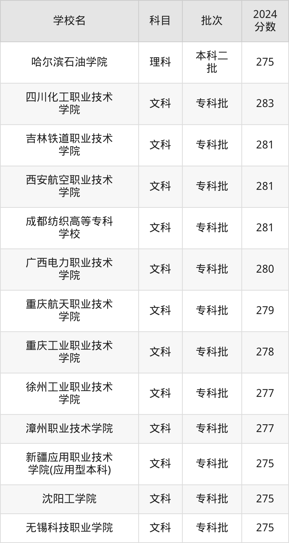 文科科目考生能上的有12所,包括1所本科医科大学和11所专科医科大学。具体有:四川化工职业技术学院(283分)、吉林铁道职业技术学院(281分)、西安航空职业技术学院(281分)、成都纺织高等专科学校(281分)等。