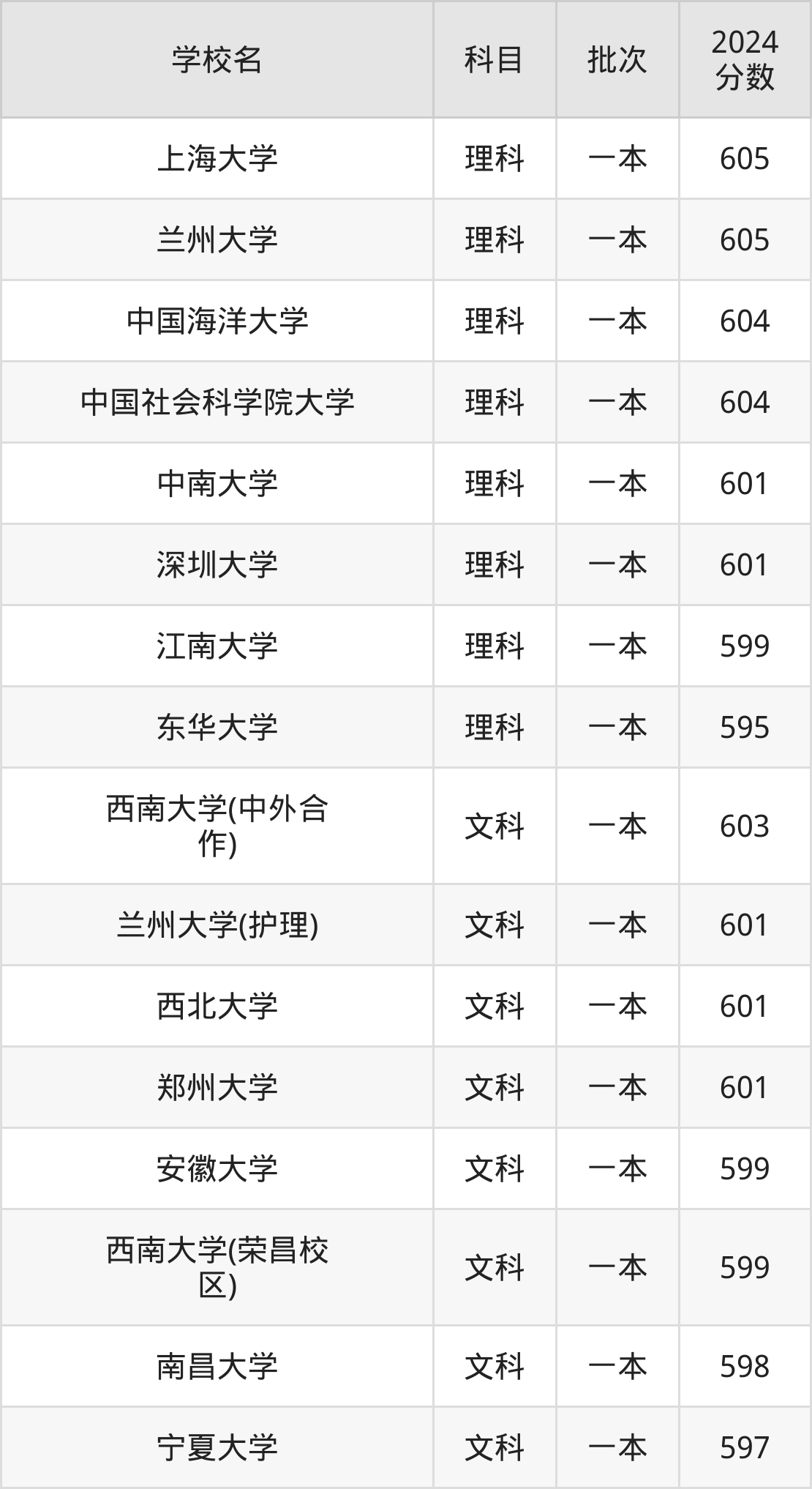 文科科目考生能上的有11所,全部在本科批次录取。具体有:西南大学(中外合作)(603分)、兰州大学(护理)(601分)、西北大学(601分)、郑州大学(601分)等。