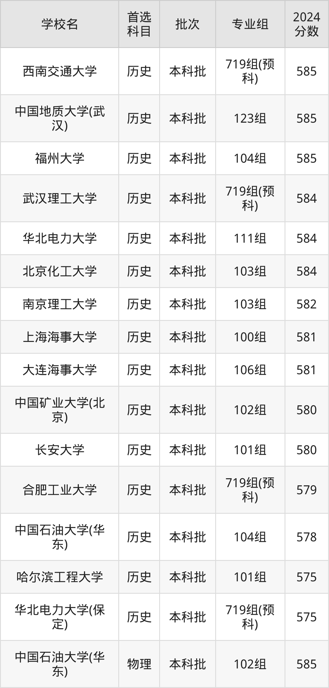 首选历史科目考生能上的有15所,全部在本科批次录取。具体有:西南交通大学719组(预科)(585分)、中国地质大学(武汉)123组(585分)、福州大学104组(585分)、武汉理工大学719组(预科)(584分)等;