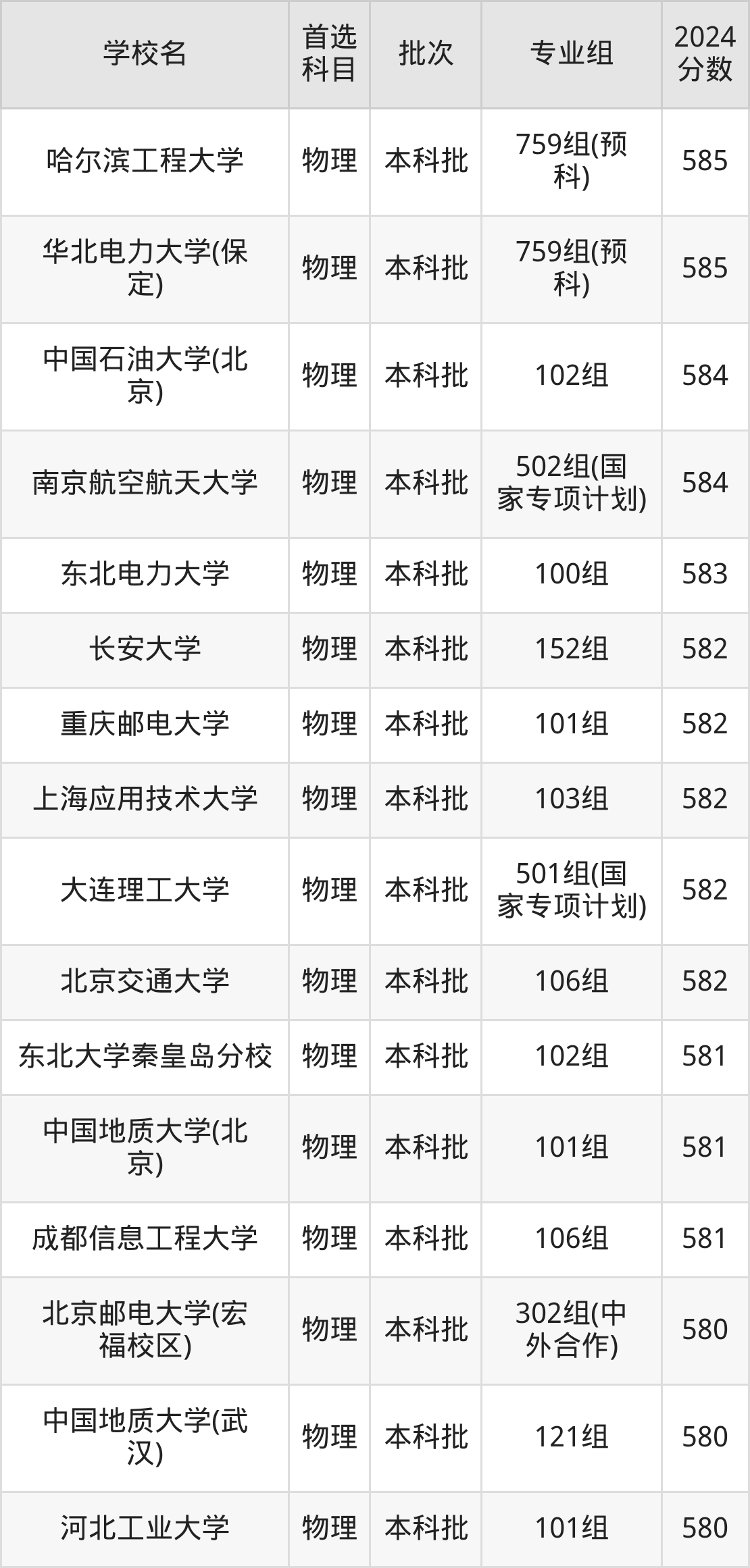 首选物理科目考生能上的有28所,全部在本科批次录取。具体有:中国石油大学(华东)102组(585分)、哈尔滨工程大学759组(预科)(585分)、华北电力大学(保定)759组(预科)(585分)、中国石油大学(北京)102组(584分)等。