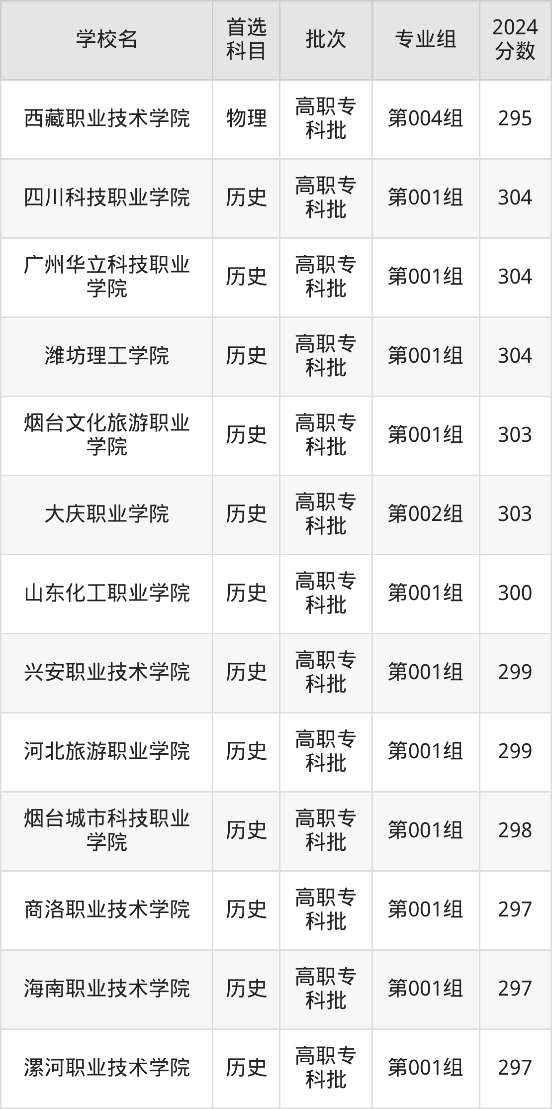 根据2024年高考招录数据,录取分数线刚好为300分的综合类大学有山东化工职业学院、洛阳科技职业学院。下面是这些学校的相关介绍: