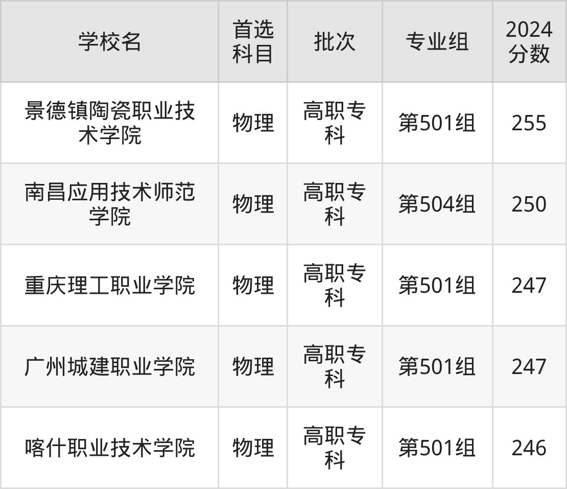 首选物理科目考生能上的有5所,包括1所本科医科大学和4所专科医科大学。具体有:景德镇陶瓷职业技术学院第501组(255分)、南昌应用技术师范学院第504组(250分)、重庆理工职业学院第501组(247分)、广州城建职业学院第501组(247分)等。