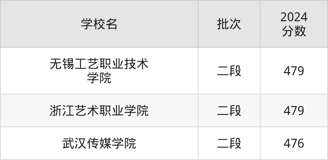 根据2024年高考招录数据,录取分数线在480分左右的艺术类大学有无锡工艺职业技术学院、浙江艺术职业学院、武汉传媒学院。下面是这些学校的相关介绍: