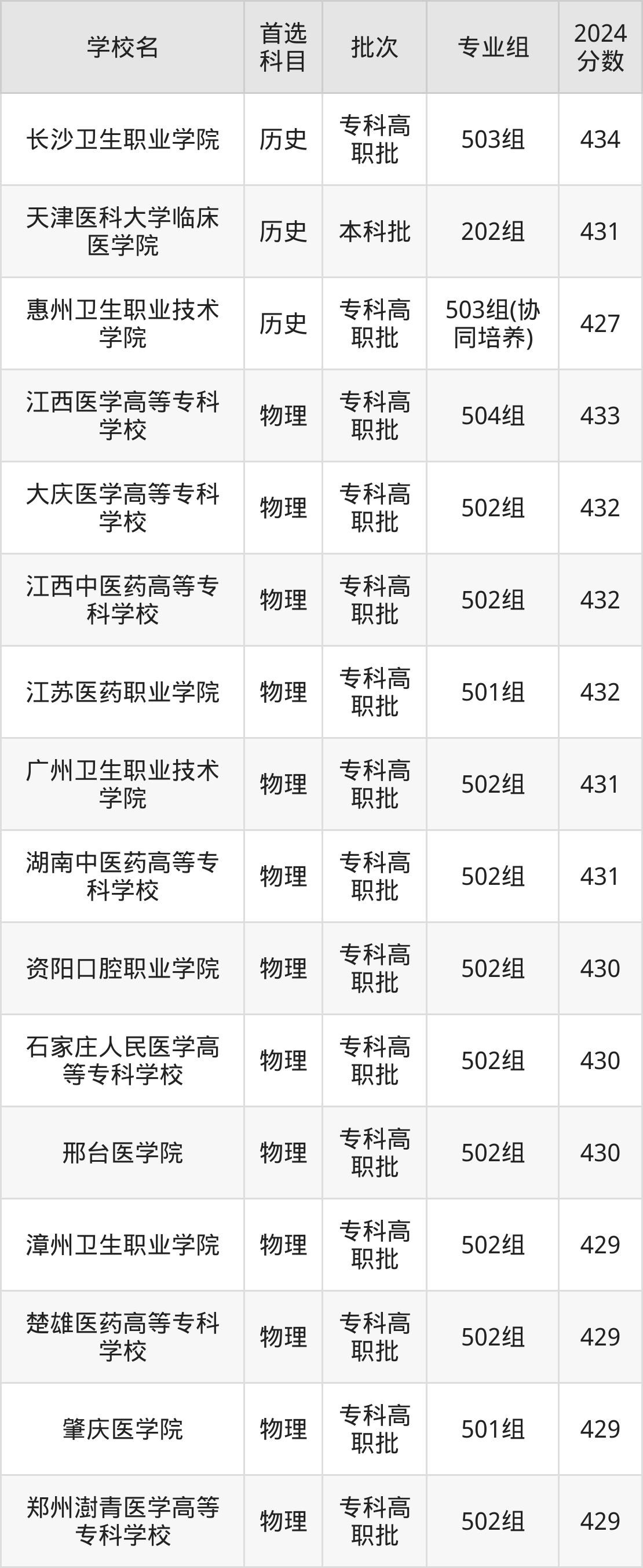 2、石家庄人民医学高等专科学校(2024年物理类502组430分)
