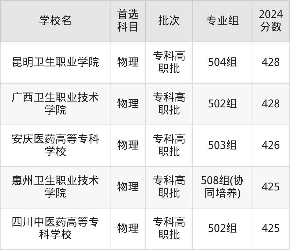 首选物理科目考生能上的有18所,包括2所本科医科大学和16所专科医科大学。具体有:江西医学高等专科学校504组(433分)、大庆医学高等专科学校502组(432分)、江西中医药高等专科学校502组(432分)、江苏医药职业学院501组(432分)等。