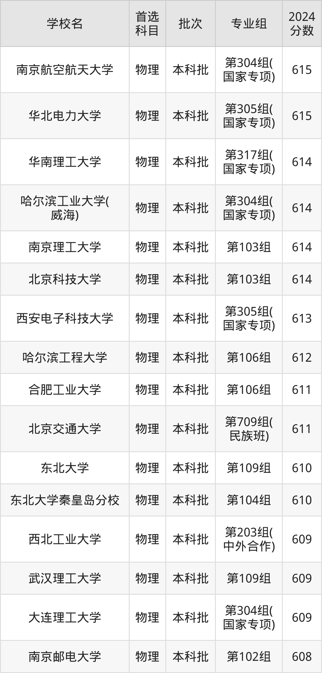 首选物理科目考生能上的有21所,全部在本科批次录取。具体有:南京航空航天大学第304组(国家专项)(615分)、华北电力大学第305组(国家专项)(615分)、华南理工大学第317组(国家专项)(614分)、哈尔滨工业大学(威海)第304组(国家专项)(614分)等;