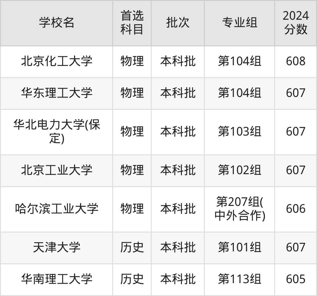 首选历史科目考生能上的有2所,全部在本科批次录取。具体有:天津大学第101组(607分)、华南理工大学第113组(605分)。
