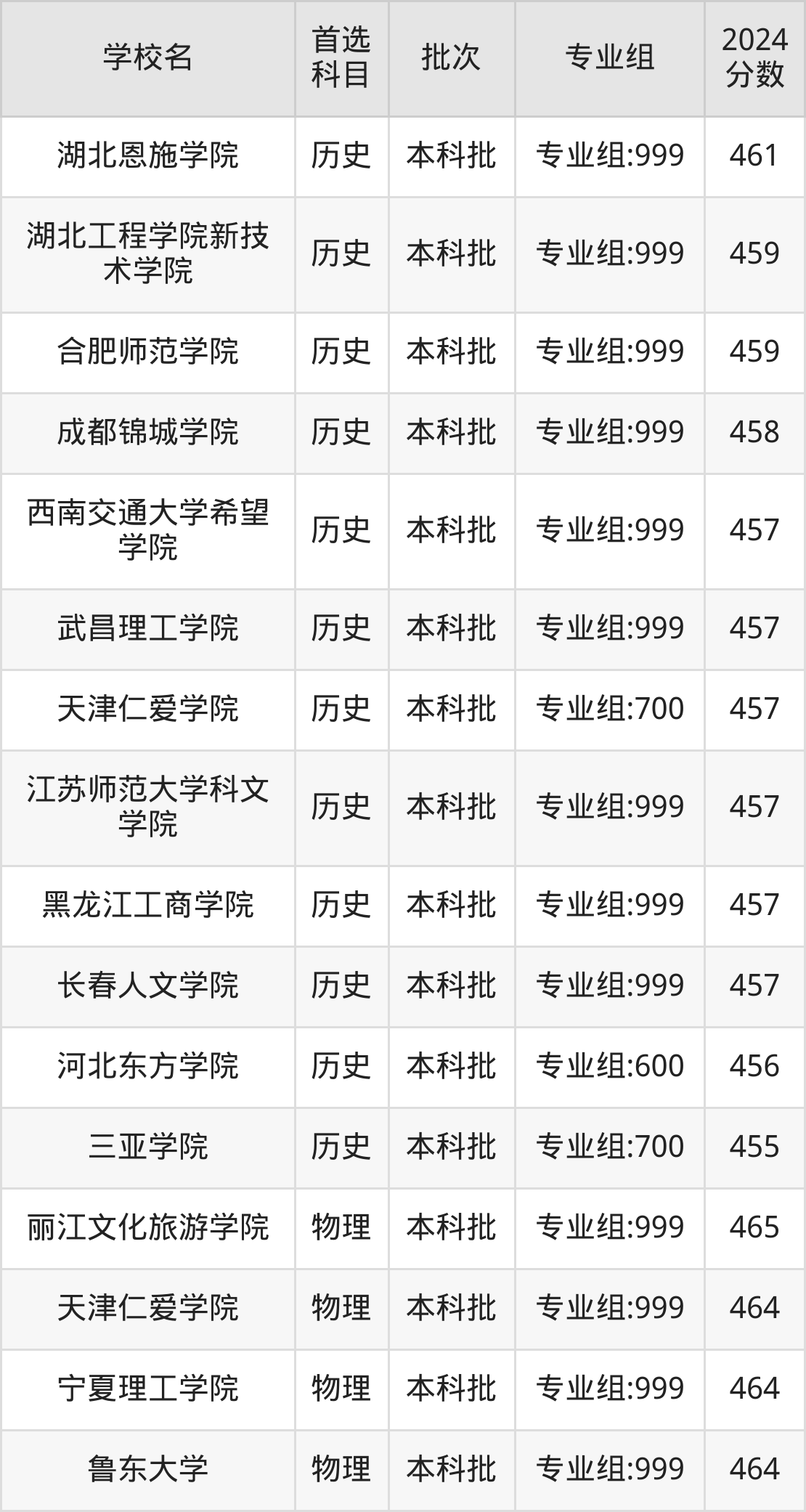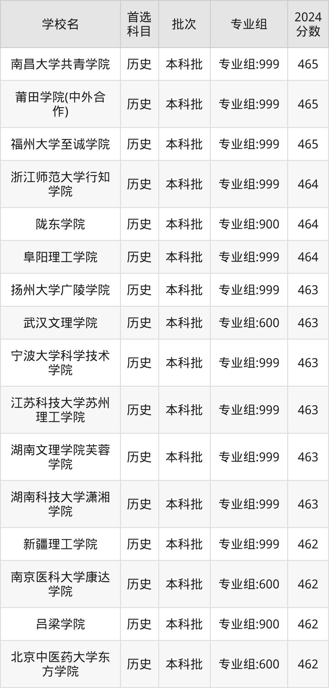 首选历史科目考生能上的有28所,全部在本科批次录取。具体有:南昌大学共青学院专业组:999(465分)、莆田学院(中外合作)专业组:999(465分)、福州大学至诚学院专业组:999(465分)、浙江师范大学行知学院专业组:999(464分)等;