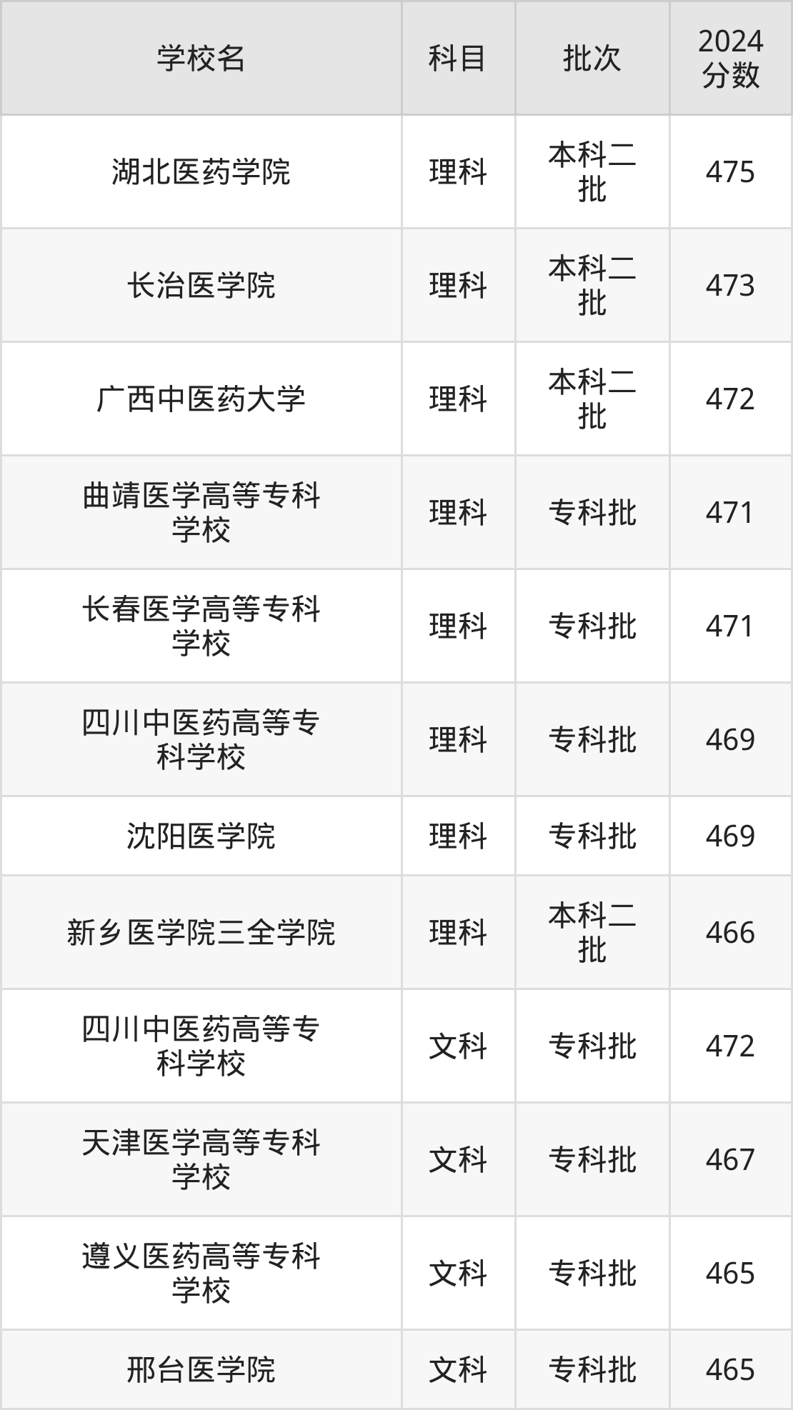 理科科目考生能上的有8所,包括5所本科医科大学和3所专科医科大学。具体有:湖北医药学院(475分)、长治医学院(473分)、广西中医药大学(472分)、曲靖医学高等专科学校(471分)等;
