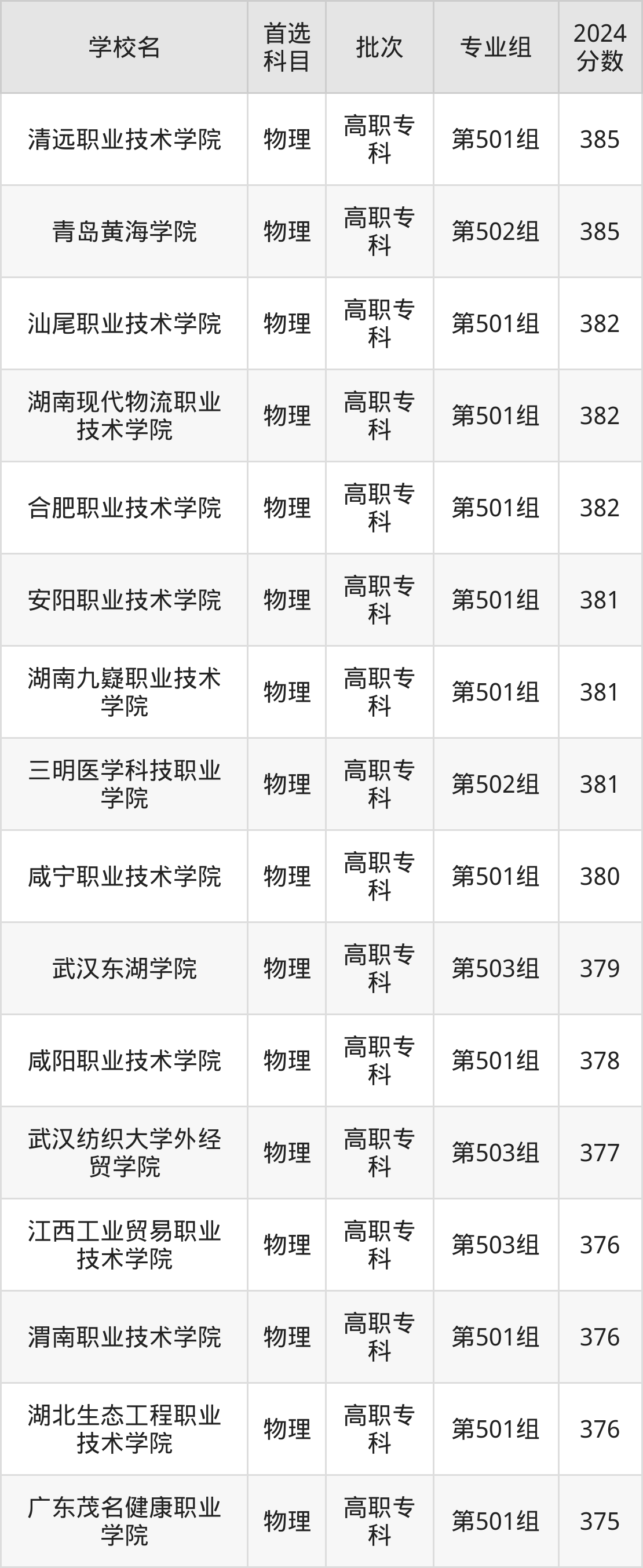 1、咸宁职业技术学院(2024年物理类第501组380分)