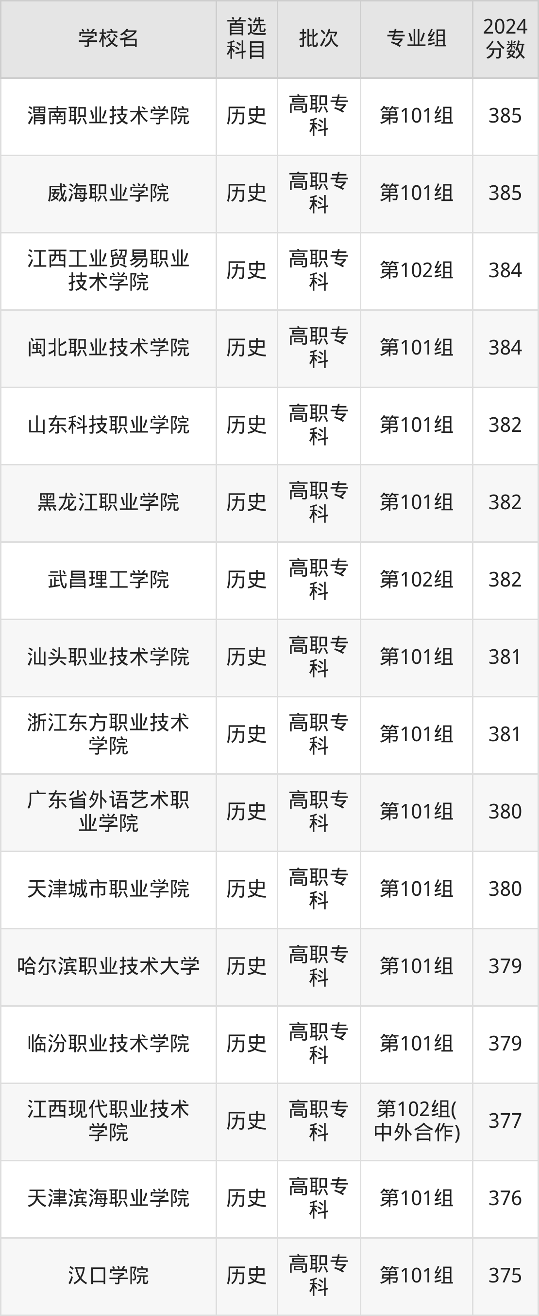 首选历史科目考生能上的有16所,包括3所本科医科大学和13所专科医科大学。具体有:渭南职业技术学院第101组(385分)、威海职业学院第101组(385分)、江西工业贸易职业技术学院第102组(384分)、闽北职业技术学院第101组(384分)等。