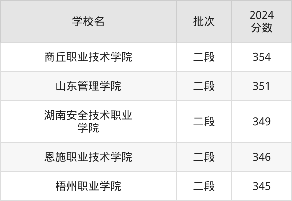 根据2024年高考招录数据,录取分数线在350分左右的综合类大学有湖南安全技术职业学院、山东管理学院、商丘职业技术学院。下面是这些学校的相关介绍: