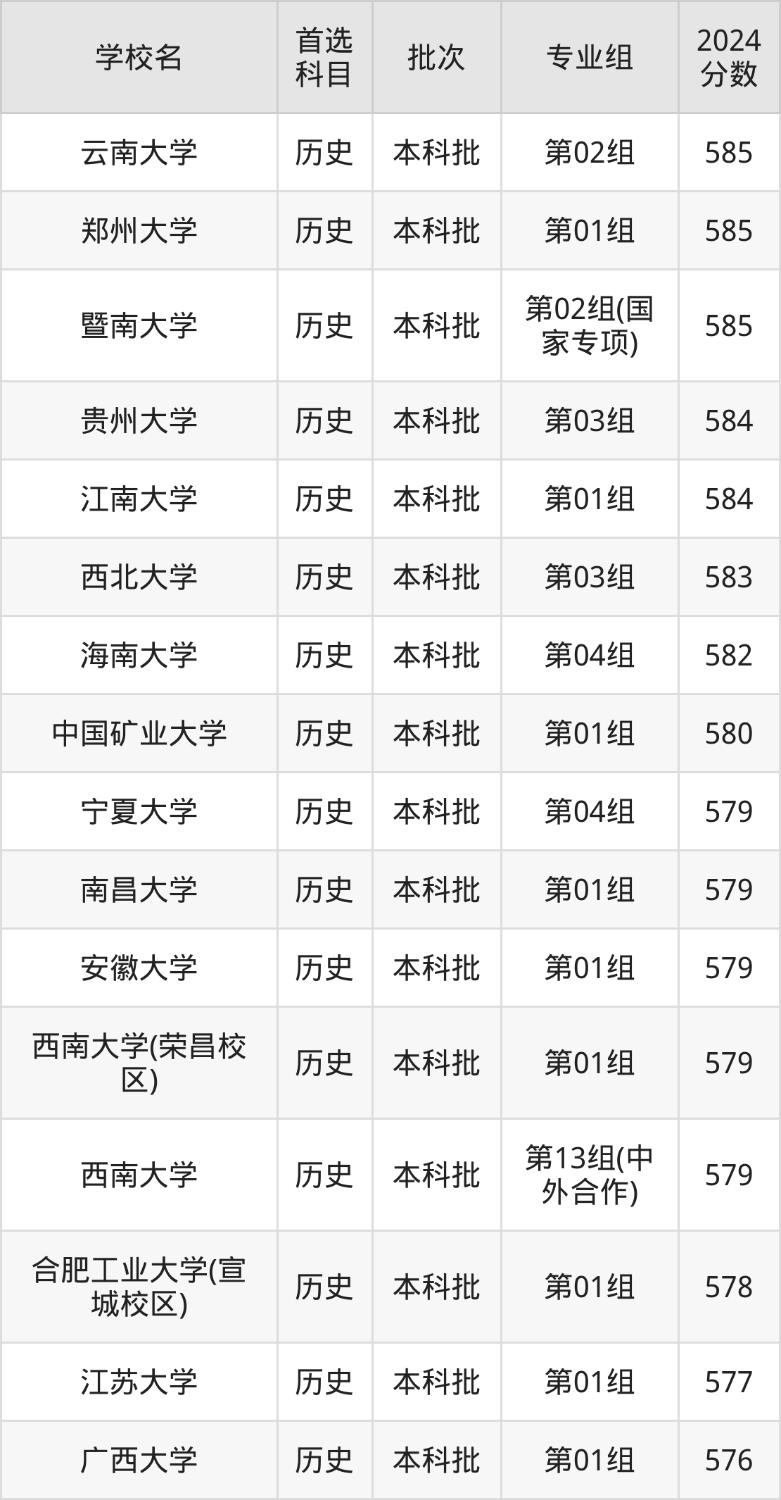 首选历史科目考生能上的有20所,全部在本科批次录取。具体有:云南大学第02组(585分)、郑州大学第01组(585分)、暨南大学第02组(国家专项)(585分)、贵州大学第03组(584分)等;