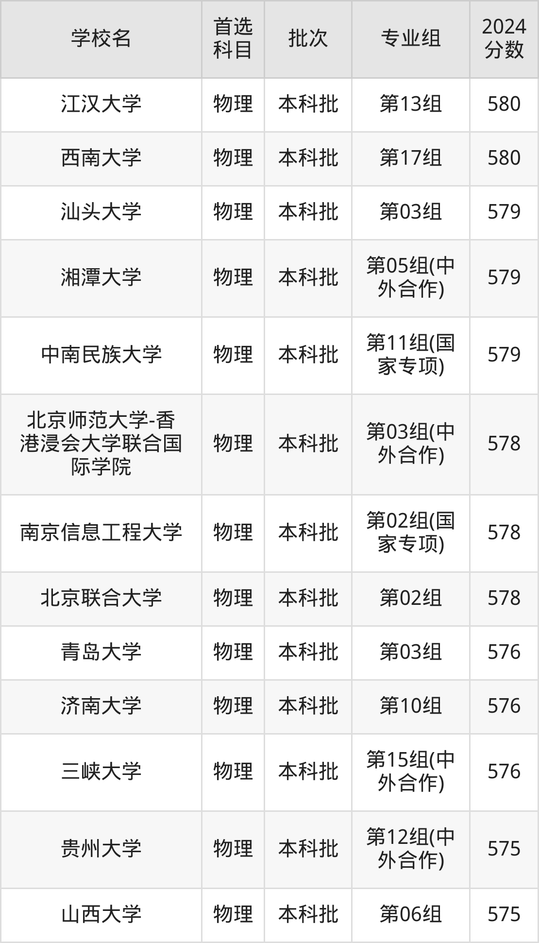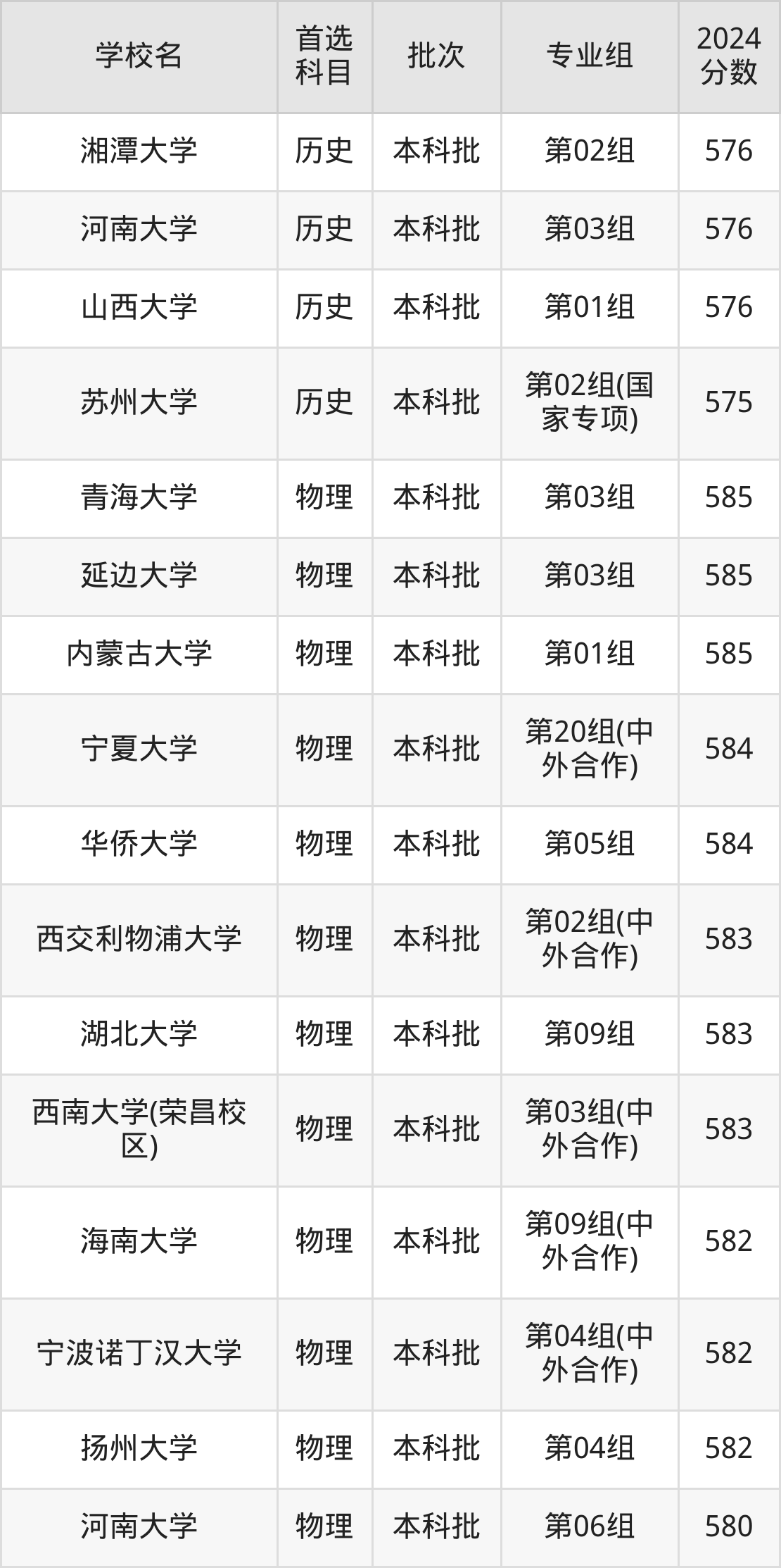 首选物理科目考生能上的有25所,全部在本科批次录取。具体有:青海大学第03组(585分)、延边大学第03组(585分)、内蒙古大学第01组(585分)、宁夏大学第20组(中外合作)(584分)等。
