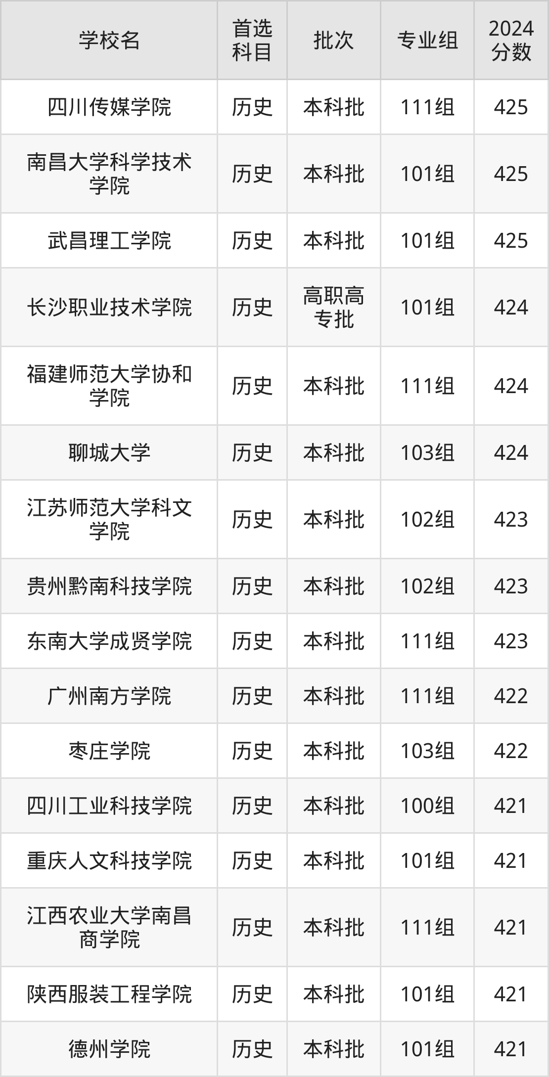 首选历史科目考生能上的有25所,包括24所本科医科大学和1所专科医科大学。具体有:四川传媒学院111组(425分)、南昌大学科学技术学院101组(425分)、武昌理工学院101组(425分)、长沙职业技术学院101组(424分)等;