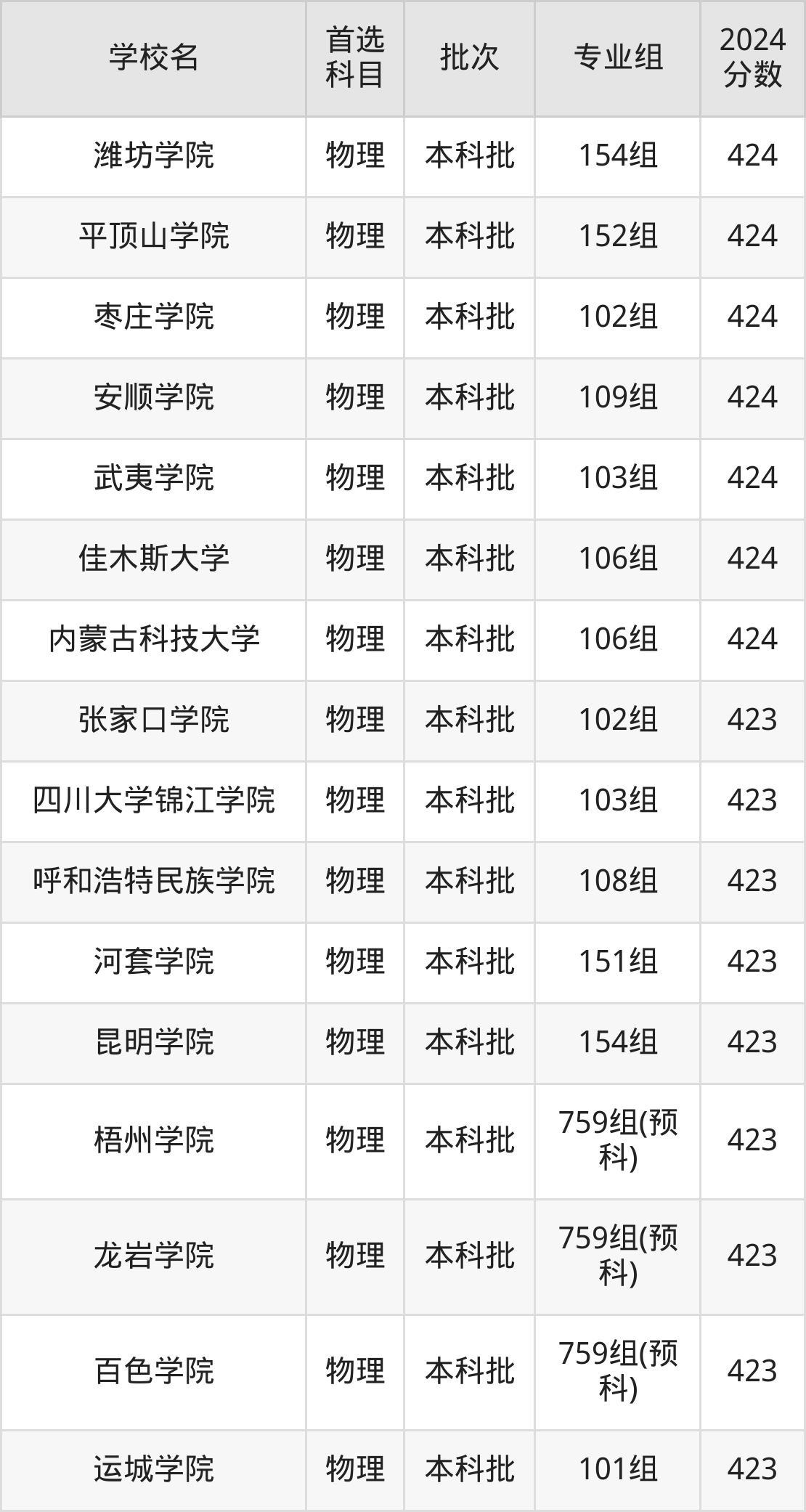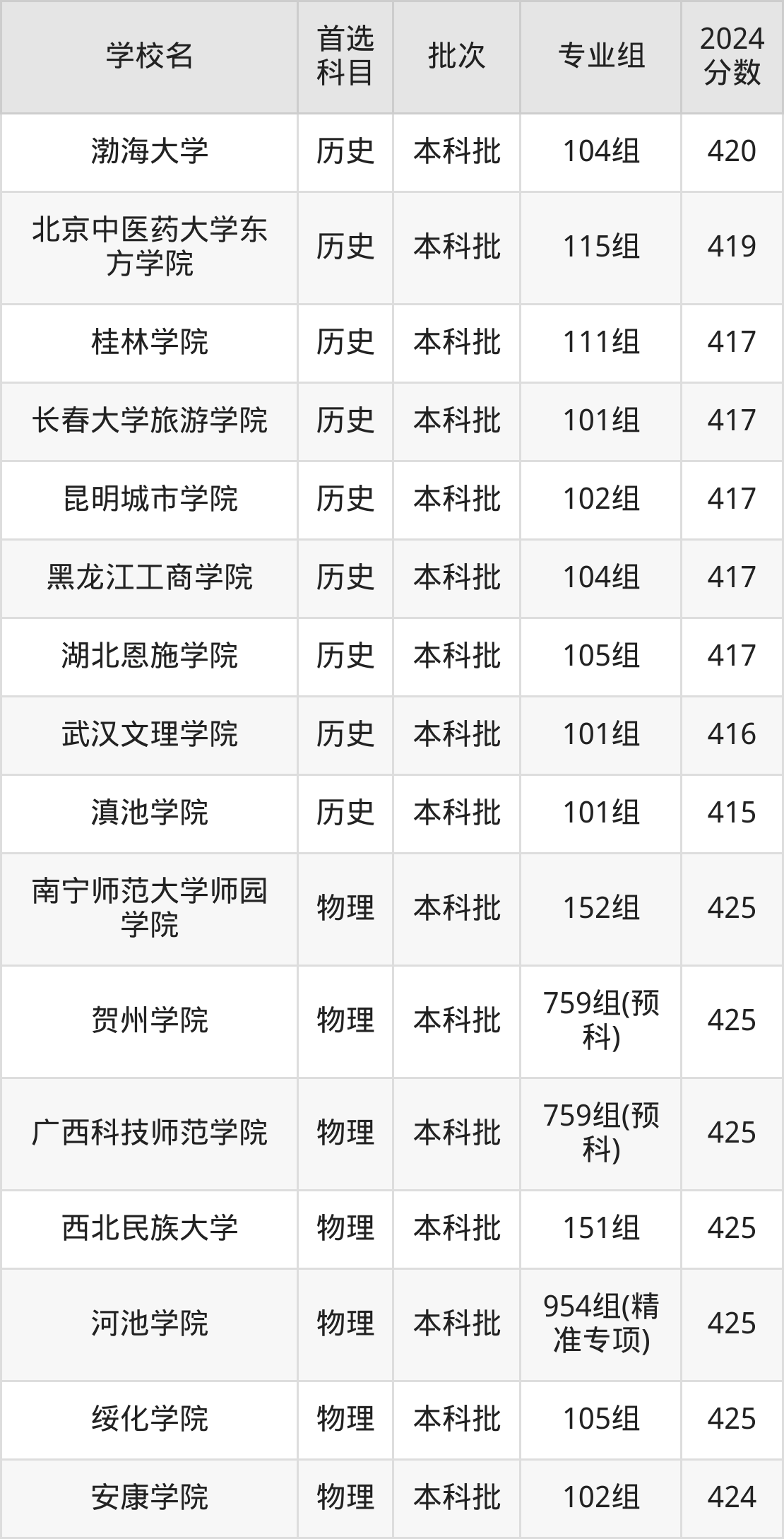 首选物理科目考生能上的有66所,包括64所本科医科大学和2所专科医科大学。具体有:南宁师范大学师园学院152组(425分)、贺州学院759组(预科)(425分)、广西科技师范学院759组(预科)(425分)、西北民族大学151组(425分)等。
