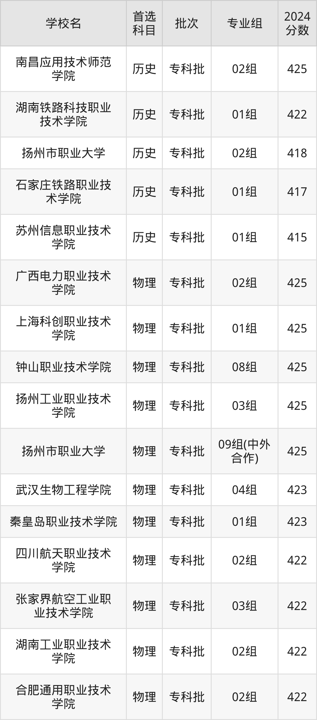 首选历史科目考生能上的有5所,包括1所本科医科大学和4所专科医科大学。具体有:南昌应用技术师范学院02组(425分)、湖南铁路科技职业技术学院01组(422分)、扬州市职业大学02组(418分)、石家庄铁路职业技术学院01组(417分)等;