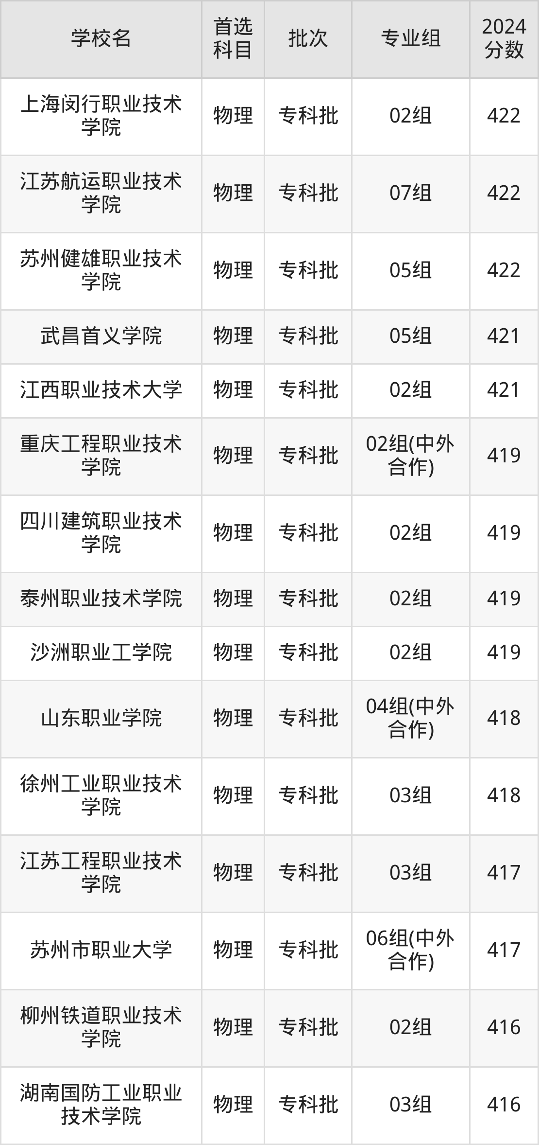 1、重庆工程职业技术学院(2024年物理类02组(中外合作)419分)