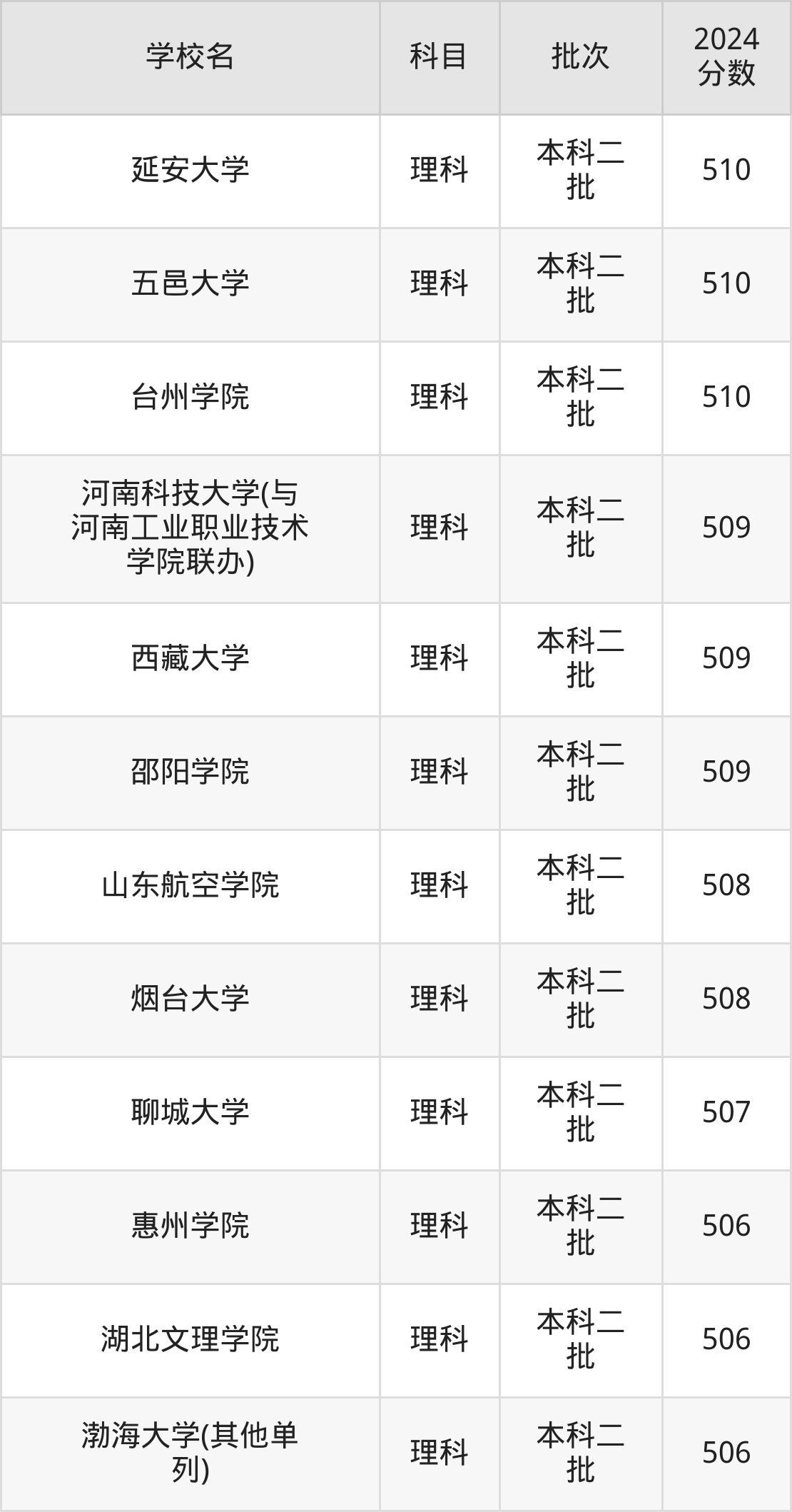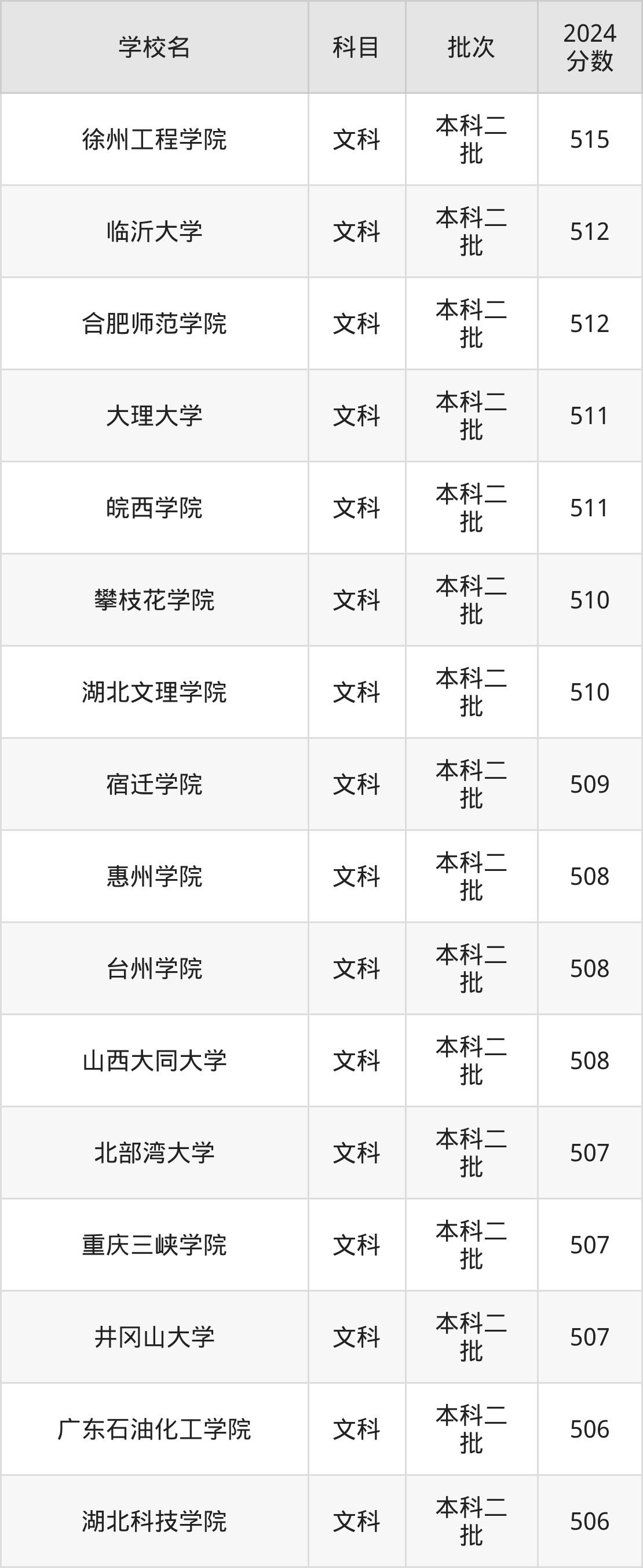 文科科目考生能上的有22所,全部在本科批次录取。具体有:徐州工程学院(515分)、临沂大学(512分)、合肥师范学院(512分)、大理大学(511分)等;