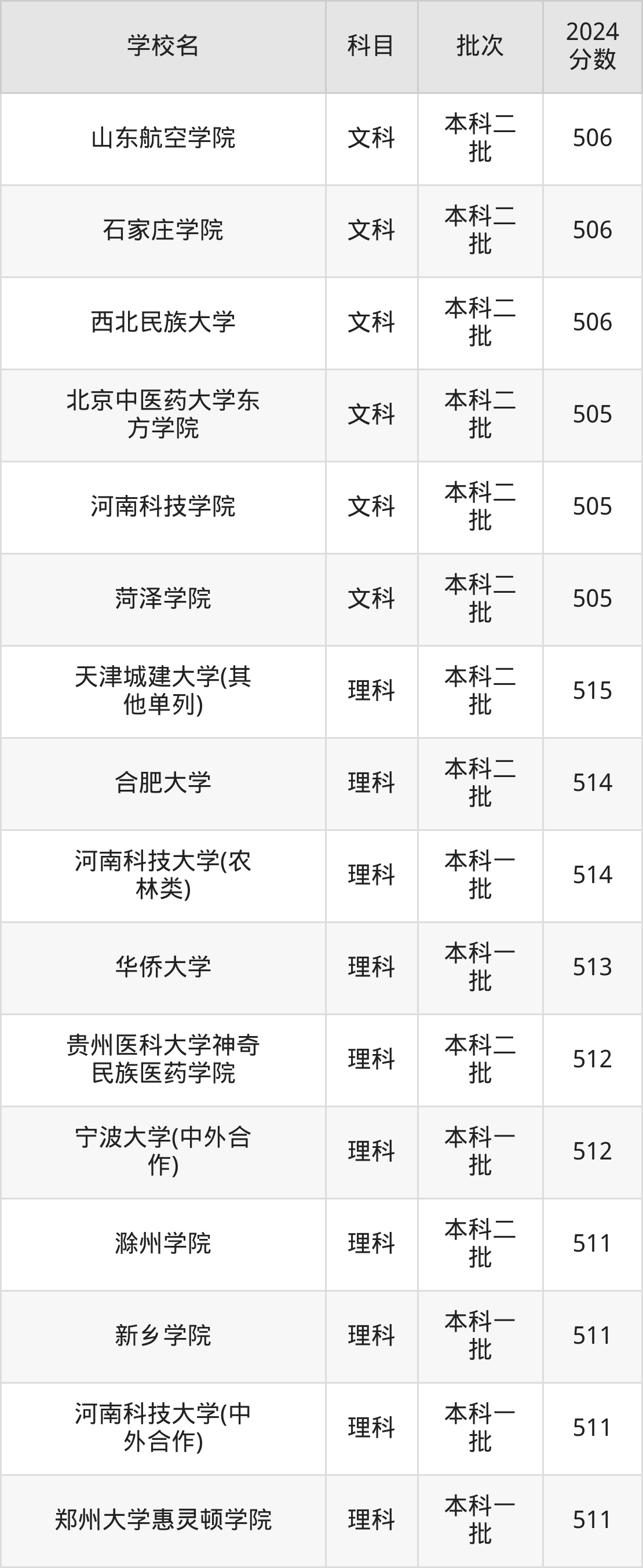 理科科目考生能上的有22所,全部在本科批次录取。具体有:天津城建大学(其他单列)(515分)、合肥大学(514分)、河南科技大学(农林类)(514分)、华侨大学(513分)等。