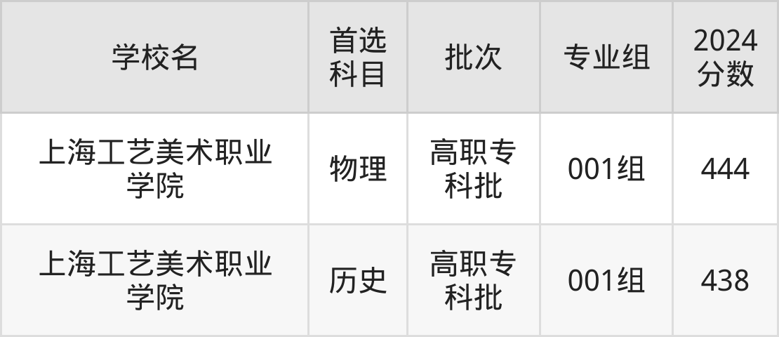 首选物理科目考生能上的有1所,全部在专科批次录取。具体有:上海工艺美术职业学院001组(444分);