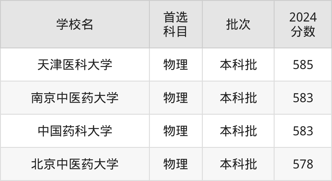 首选物理科目考生能上的有4所,全部在本科批次录取。具体有:天津医科大学(585分)、南京中医药大学(583分)、中国药科大学(583分)、北京中医药大学(578分)等。