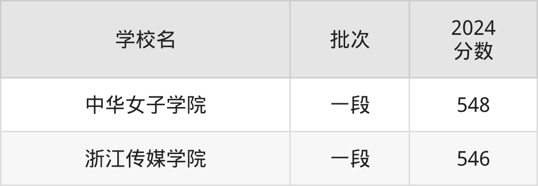 考生能上的有2所,全部在本科批次录取。具体有:中华女子学院(548分)、浙江传媒学院(546分)。