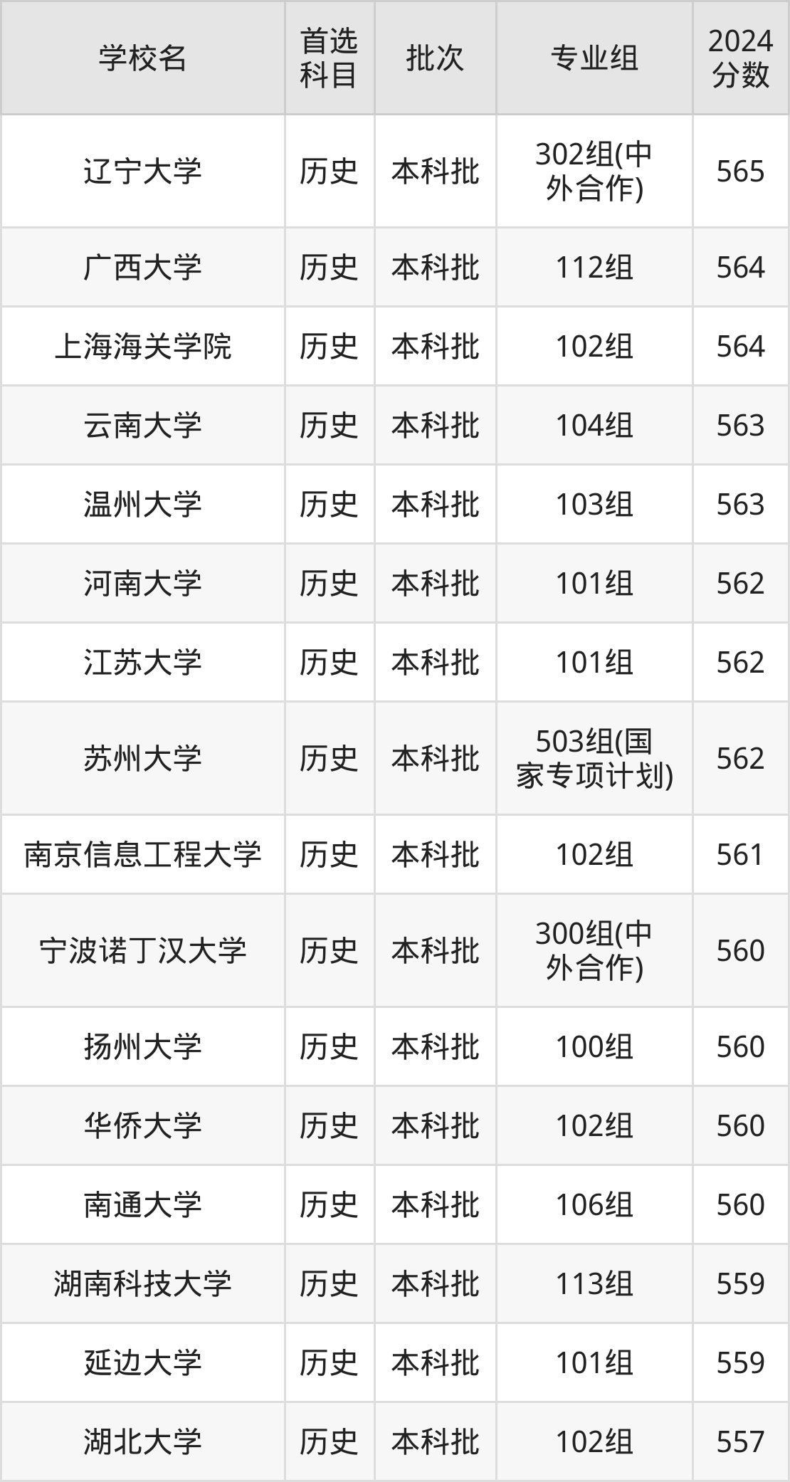 首选历史科目考生能上的有19所,全部在本科批次录取。具体有:辽宁大学302组(中外合作)(565分)、广西大学112组(564分)、上海海关学院102组(564分)、云南大学104组(563分)等;