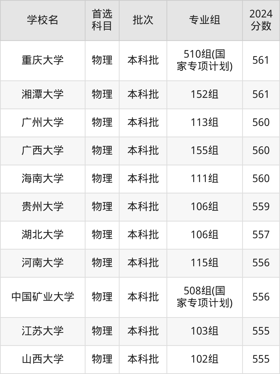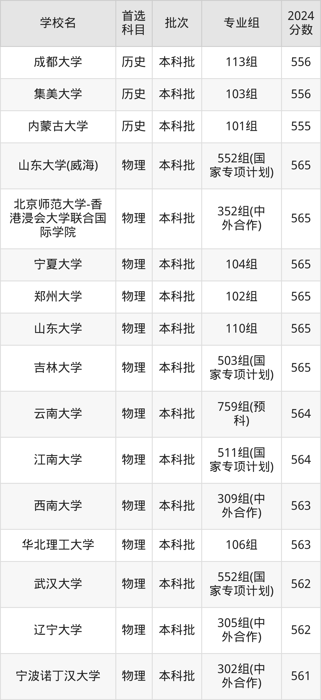 首选物理科目考生能上的有24所,全部在本科批次录取。具体有:山东大学(威海)552组(国家专项计划)(565分)、北京师范大学-香港浸会大学联合国际学院352组(中外合作)(565分)、宁夏大学104组(565分)、郑州大学102组(565分)等。