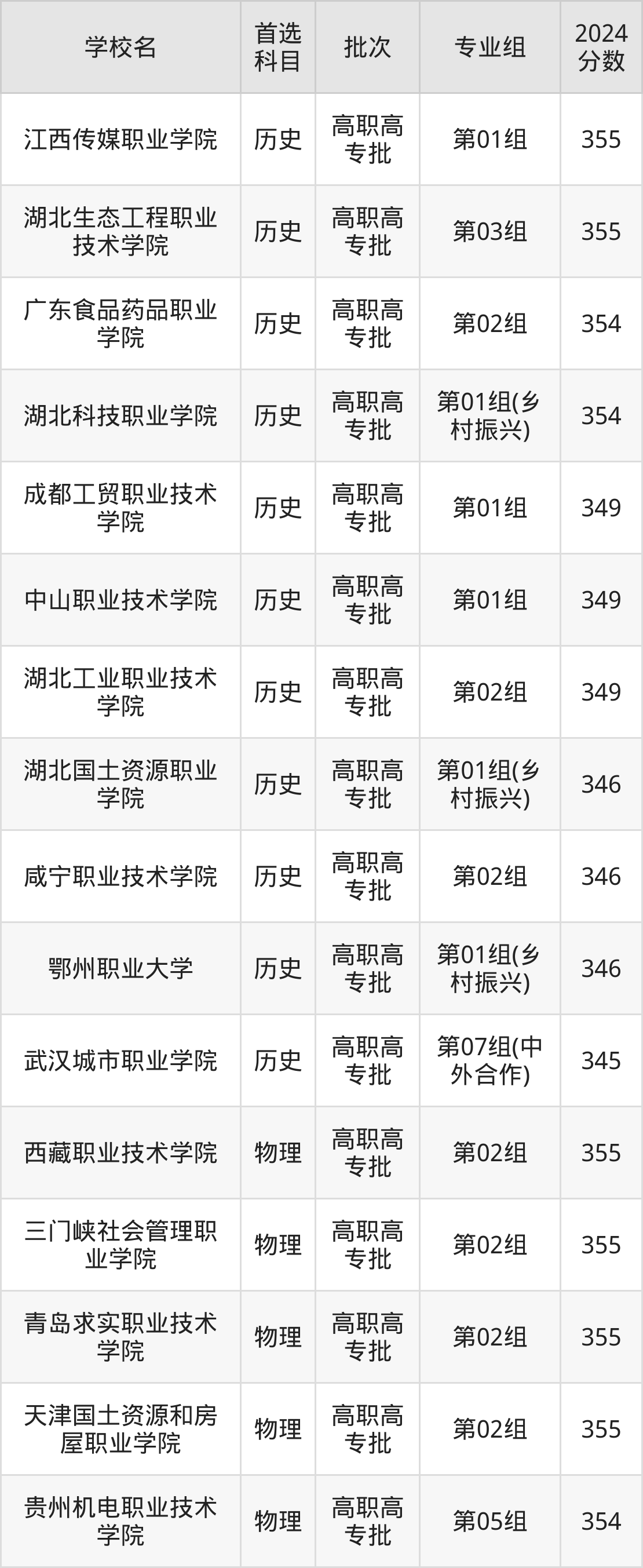首选历史科目考生能上的有11所,全部在专科批次录取。具体有:江西传媒职业学院第01组(355分)、湖北生态工程职业技术学院第03组(355分)、广东食品药品职业学院第02组(354分)、湖北科技职业学院第01组(乡村振兴)(354分)等;