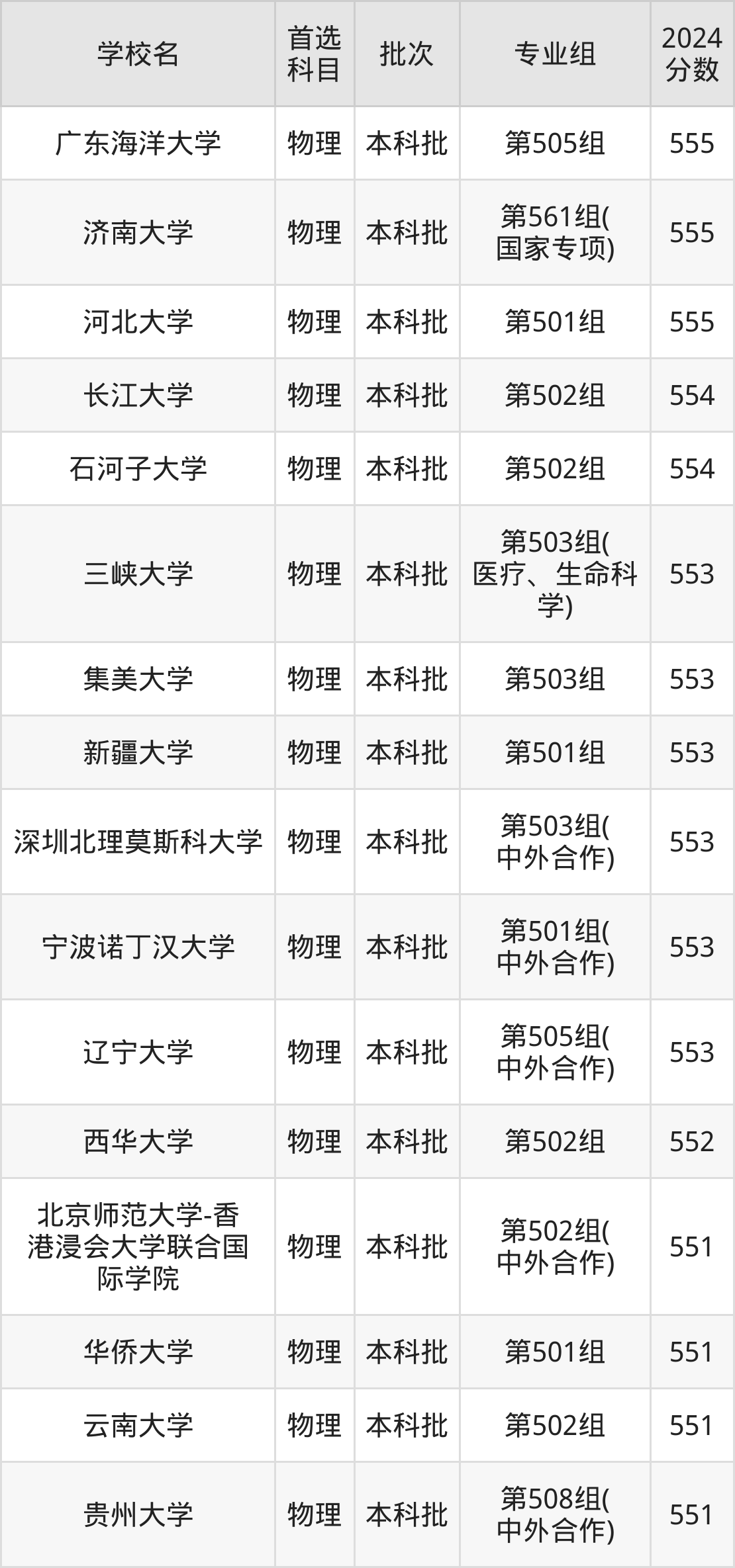首选物理科目考生能上的有22所,全部在本科批次录取。具体有:广东海洋大学第505组(555分)、济南大学第561组(国家专项)(555分)、河北大学第501组(555分)、长江大学第502组(554分)等;