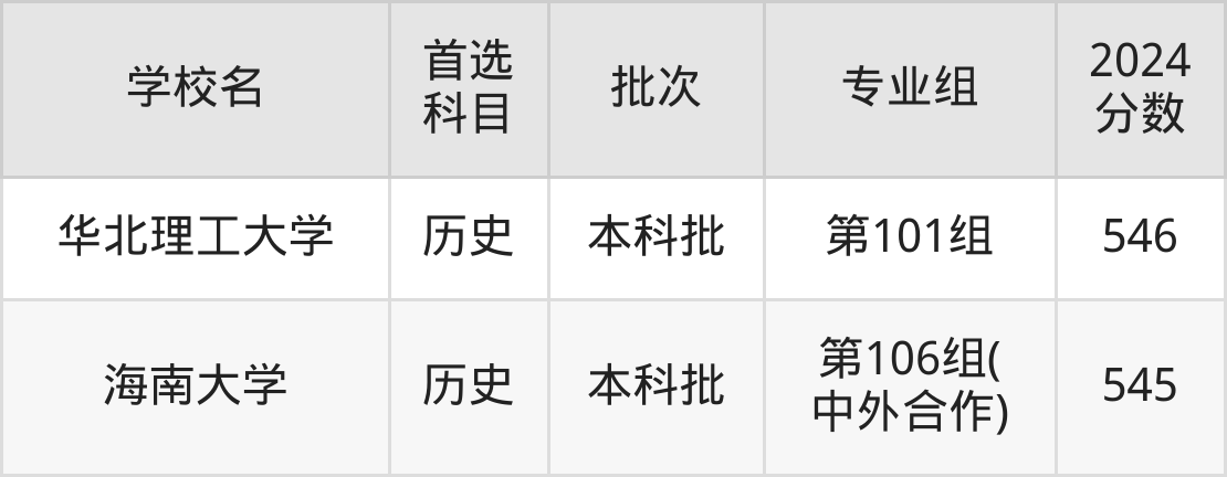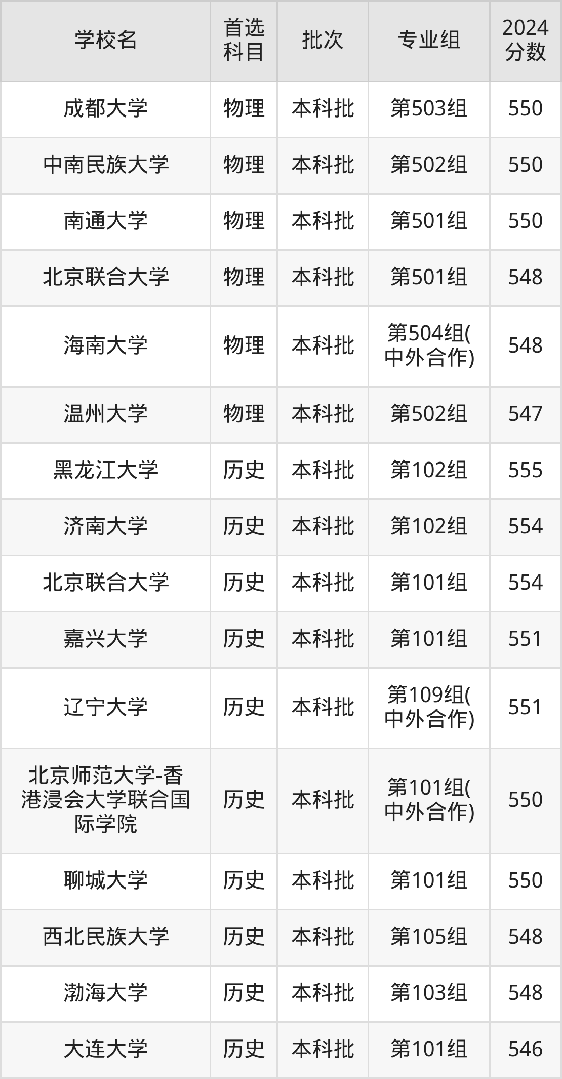 首选历史科目考生能上的有12所,全部在本科批次录取。具体有:黑龙江大学第102组(555分)、济南大学第102组(554分)、北京联合大学第101组(554分)、嘉兴大学第101组(551分)等。