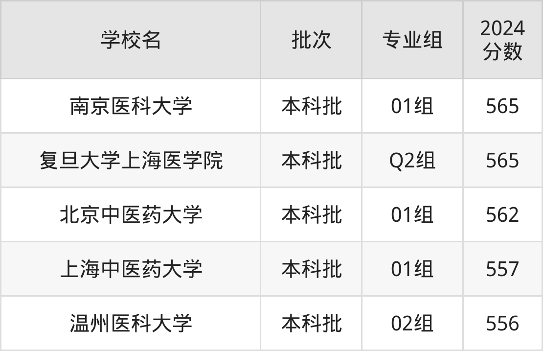 考生能上的有5所,全部在本科批次录取。具体有:南京医科大学01组(565分)、复旦大学上海医学院Q2组(565分)、北京中医药大学01组(562分)、上海中医药大学01组(557分)等。