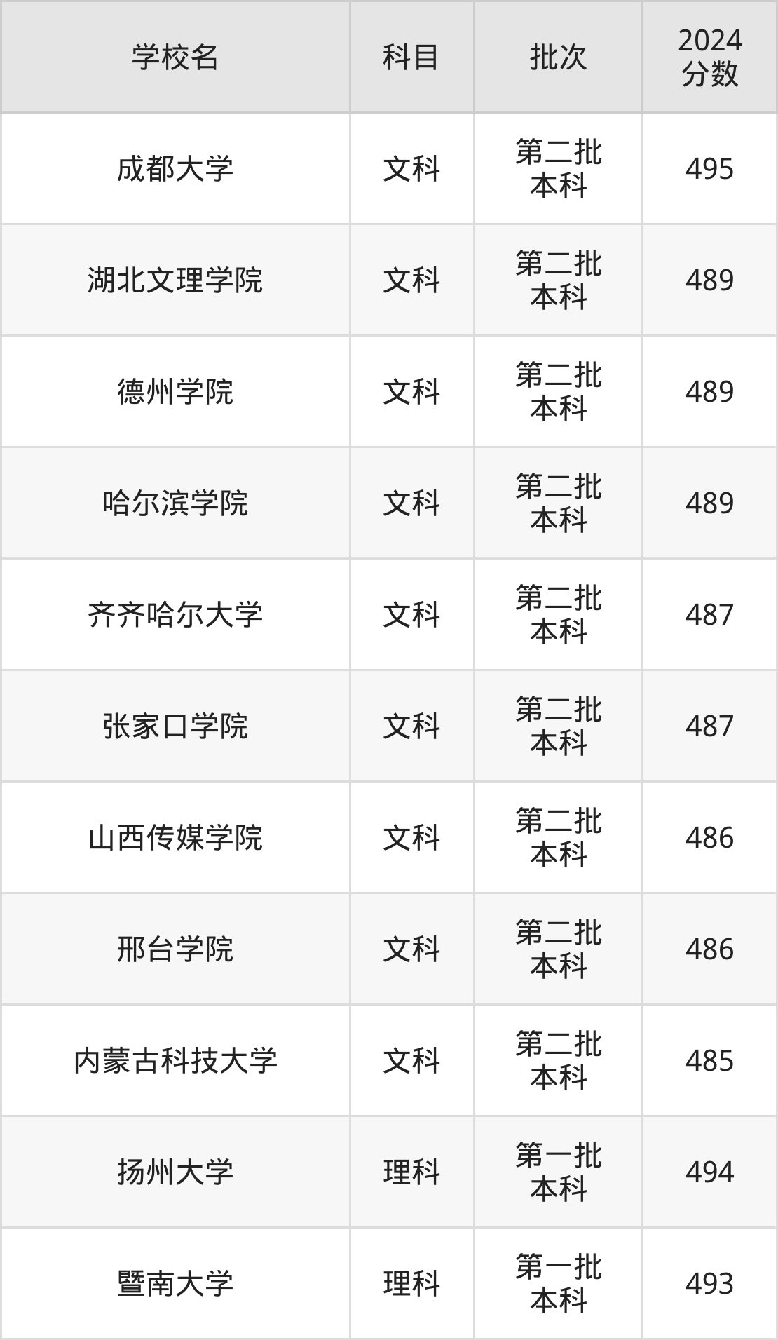 文科科目考生能上的有9所,全部在本科批次录取。具体有:成都大学(495分)、湖北文理学院(489分)、德州学院(489分)、哈尔滨学院(489分)等;