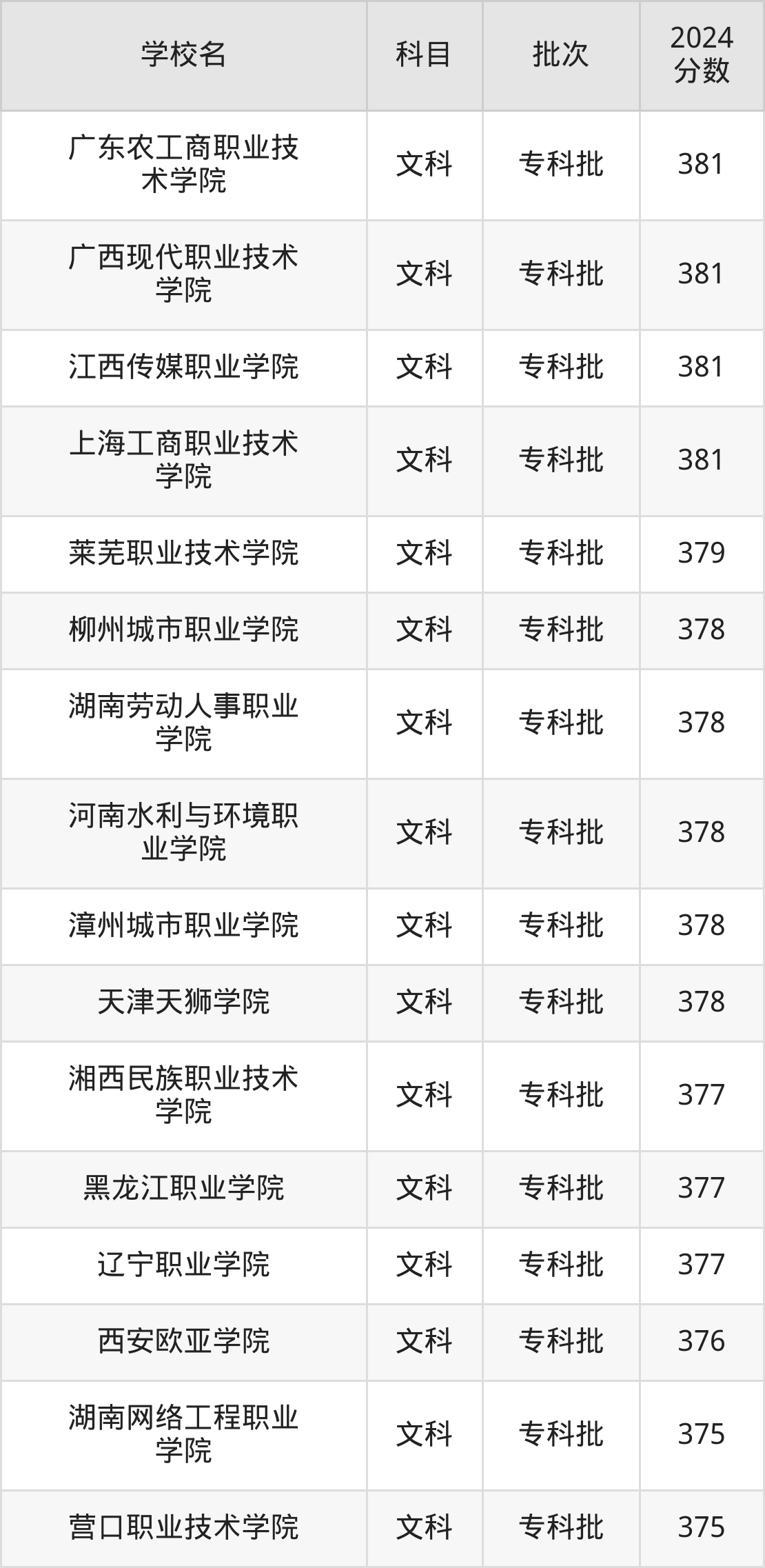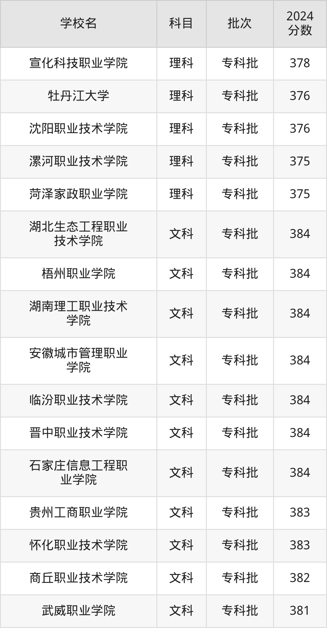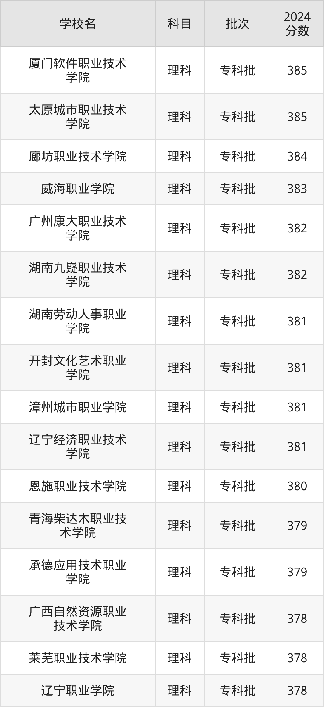 理科科目考生能上的有21所,全部在专科批次录取。具体有:厦门软件职业技术学院(385分)、太原城市职业技术学院(385分)、廊坊职业技术学院(384分)、威海职业学院(383分)等;