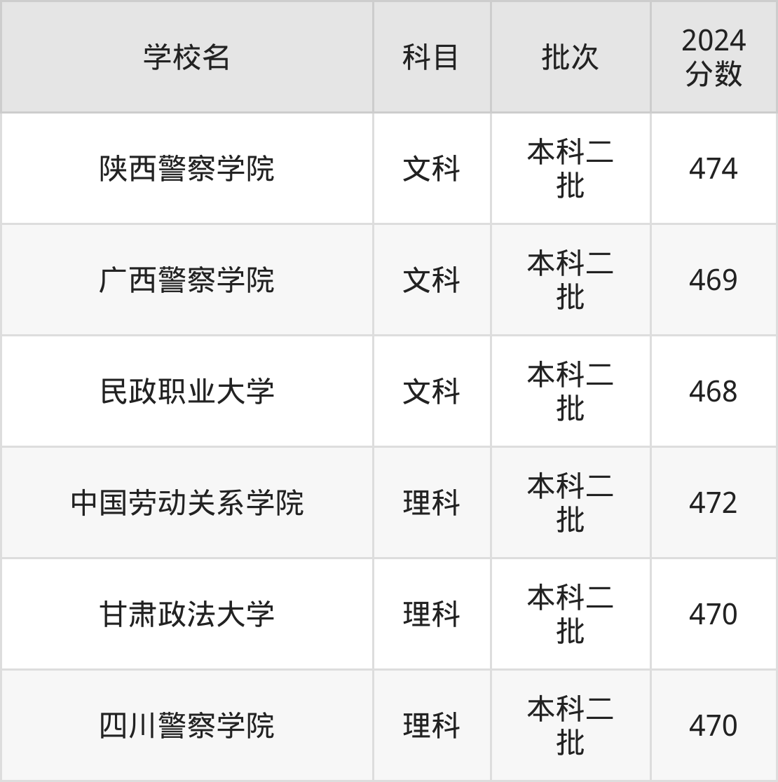 文科科目考生能上的有3所,全部在本科批次录取。具体有:陕西警察学院(474分)、广西警察学院(469分)、民政职业大学(468分);