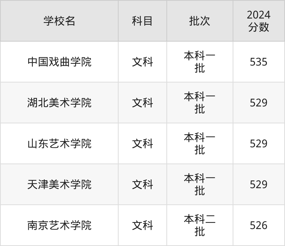 文科科目考生能上的有5所,全部在本科批次录取。具体有:中国戏曲学院(535分)、湖北美术学院(529分)、山东艺术学院(529分)、天津美术学院(529分)等。