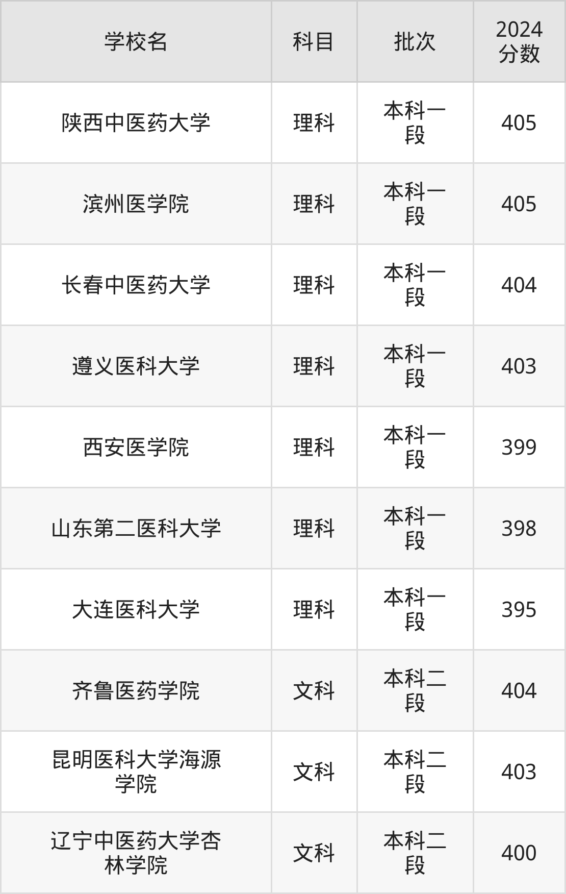 理科科目考生能上的有7所,全部在本科批次录取。具体有:陕西中医药大学(405分)、滨州医学院(405分)、长春中医药大学(404分)、遵义医科大学(403分)等;
