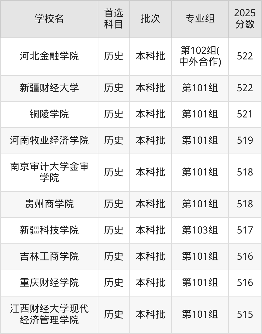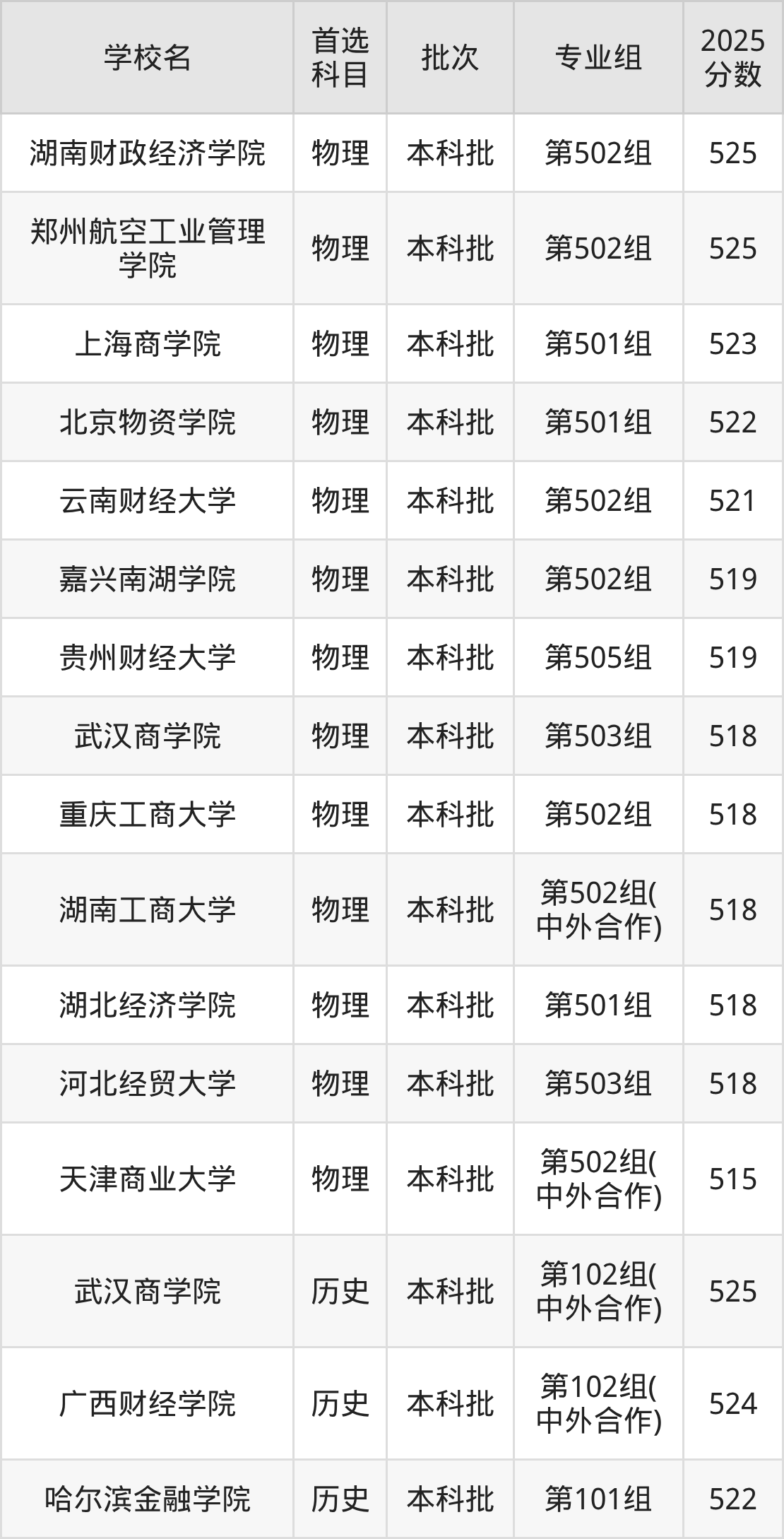 首选历史科目考生能上的有13所,全部在本科批次录取。具体有:武汉商学院第102组(中外合作)(525分)、广西财经学院第102组(中外合作)(524分)、哈尔滨金融学院第101组(522分)、河北金融学院第102组(中外合作)(522分)等。