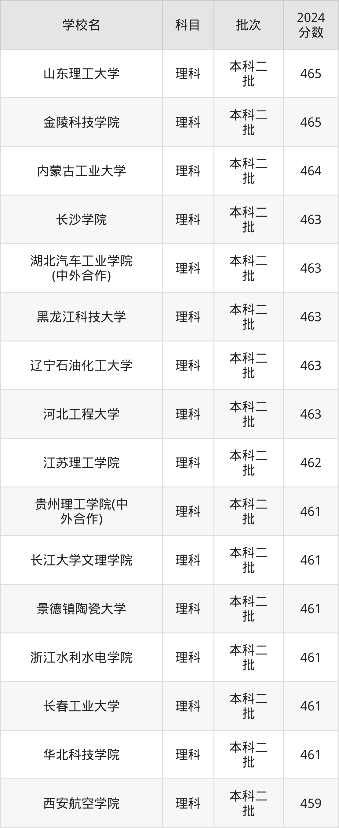 理科科目考生能上的有36所,全部在本科批次录取。具体有:山东理工大学(465分)、金陵科技学院(465分)、内蒙古工业大学(464分)、长沙学院(463分)等;