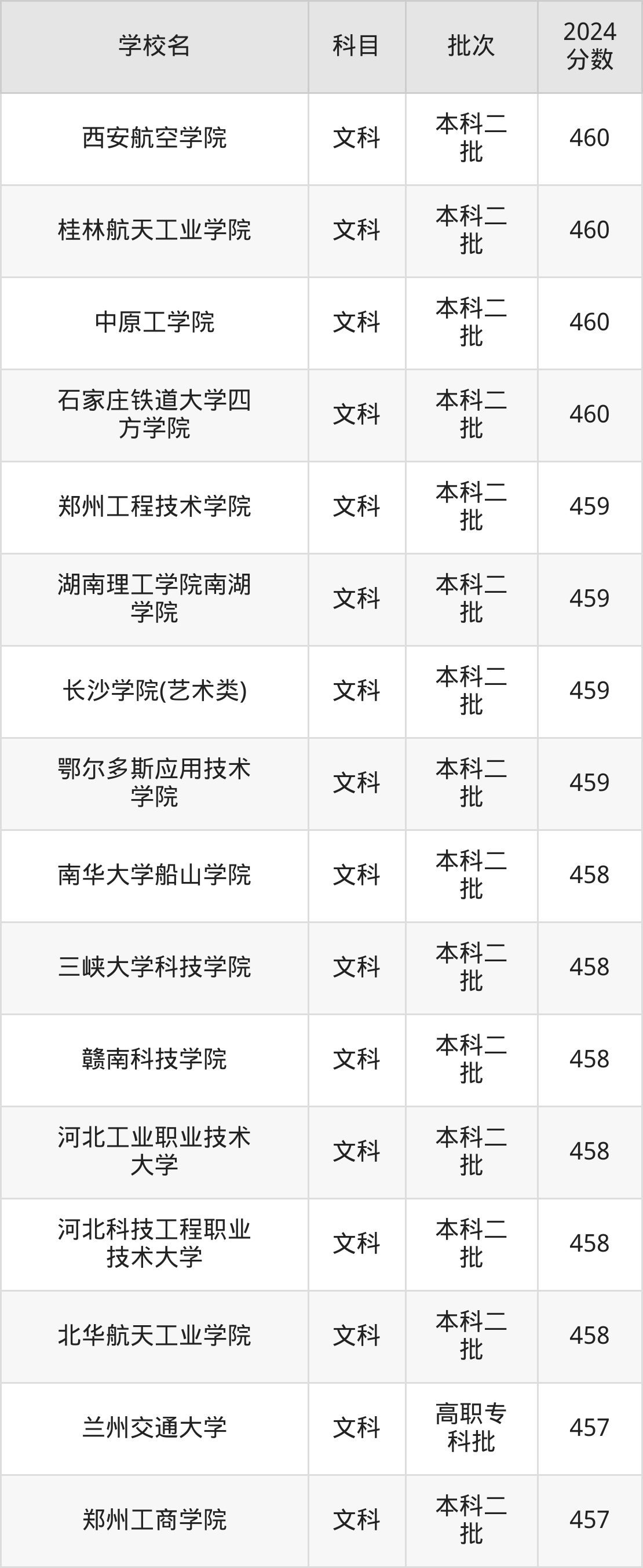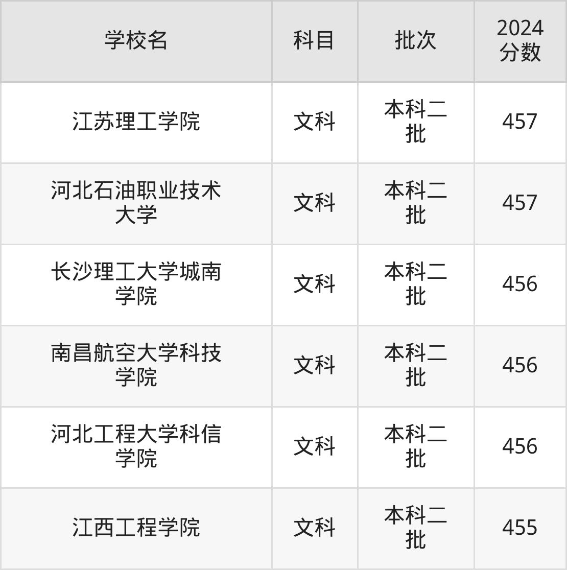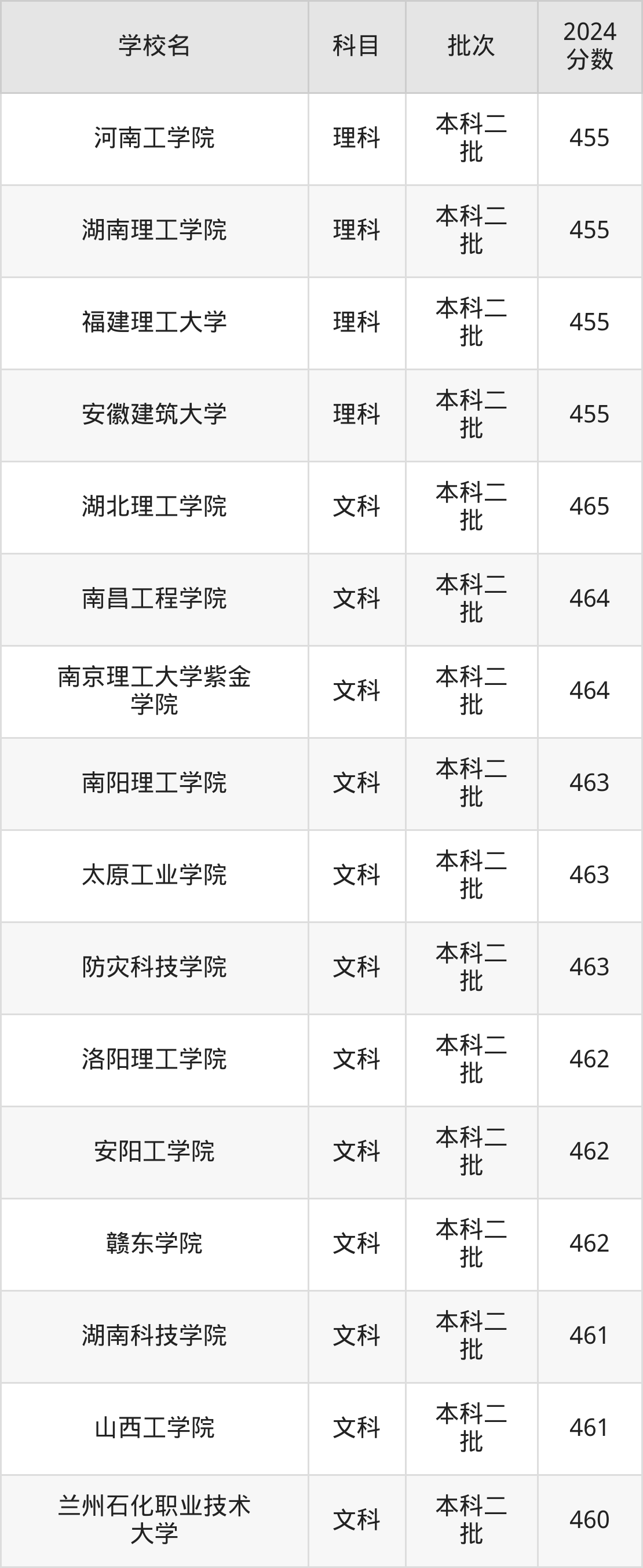 文科科目考生能上的有34所,全部在本科批次录取。具体有:湖北理工学院(465分)、南昌工程学院(464分)、南京理工大学紫金学院(464分)、南阳理工学院(463分)等。