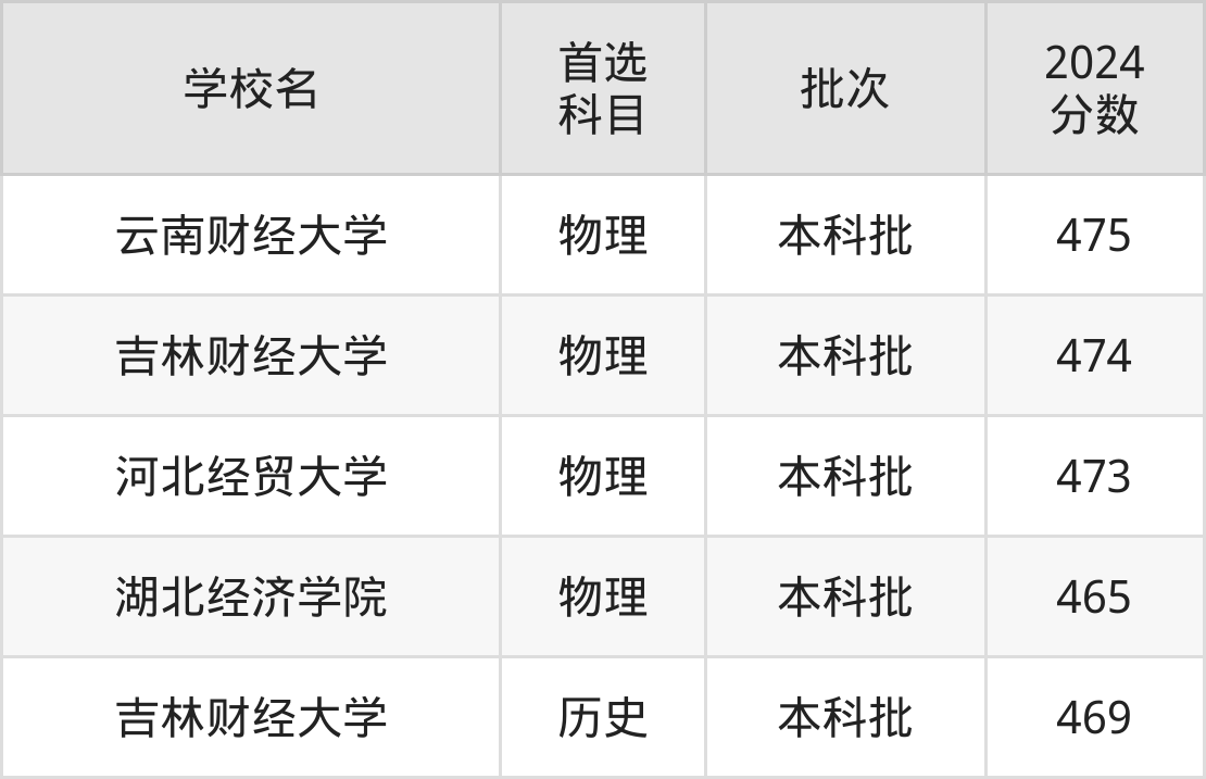 首选物理科目考生能上的有4所,全部在本科批次录取。具体有:云南财经大学(475分)、吉林财经大学(474分)、河北经贸大学(473分)、湖北经济学院(465分)等;