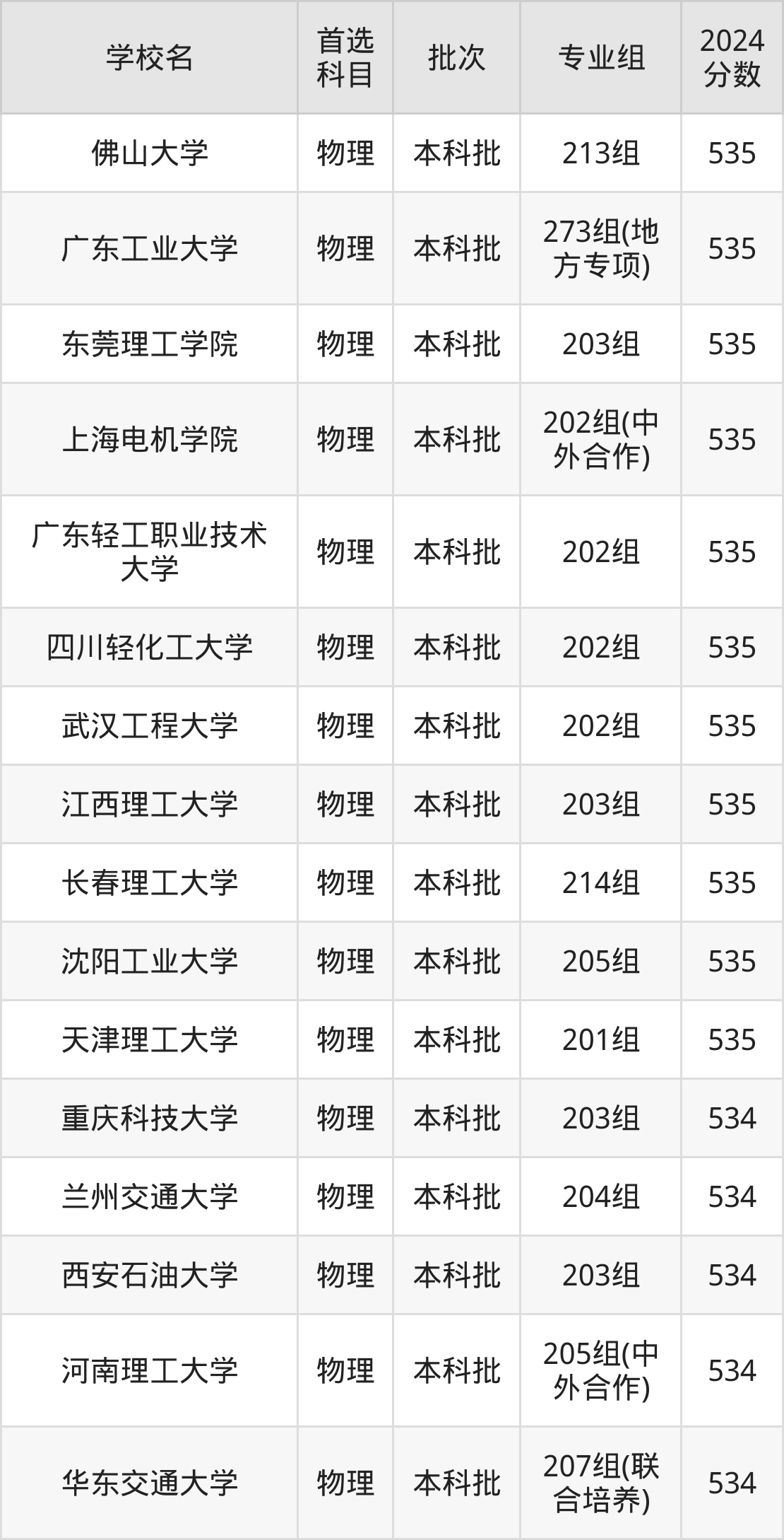 首选物理科目考生能上的有68所,全部在本科批次录取。具体有:佛山大学213组(535分)、广东工业大学273组(地方专项)(535分)、东莞理工学院203组(535分)、上海电机学院202组(中外合作)(535分)等;