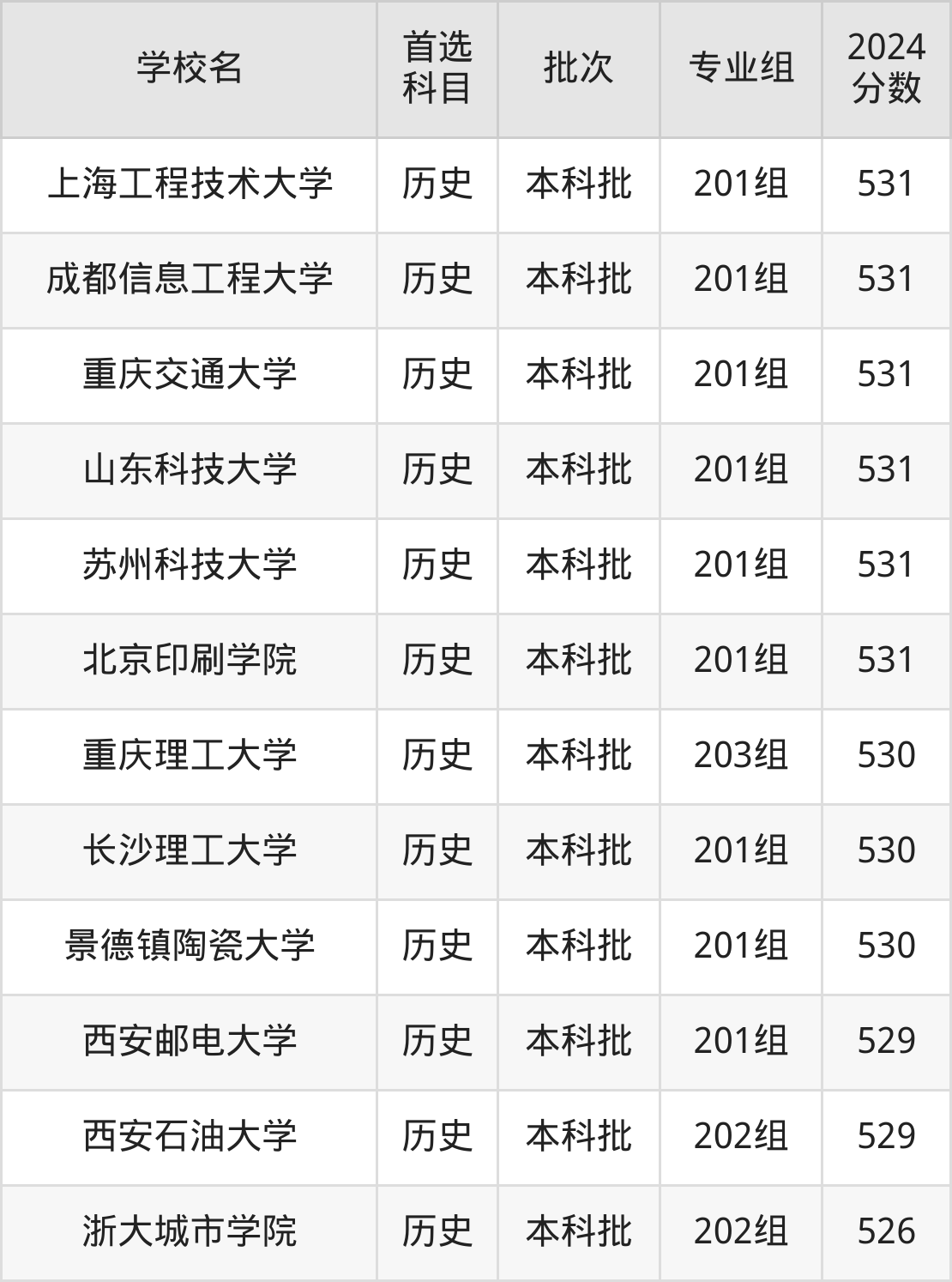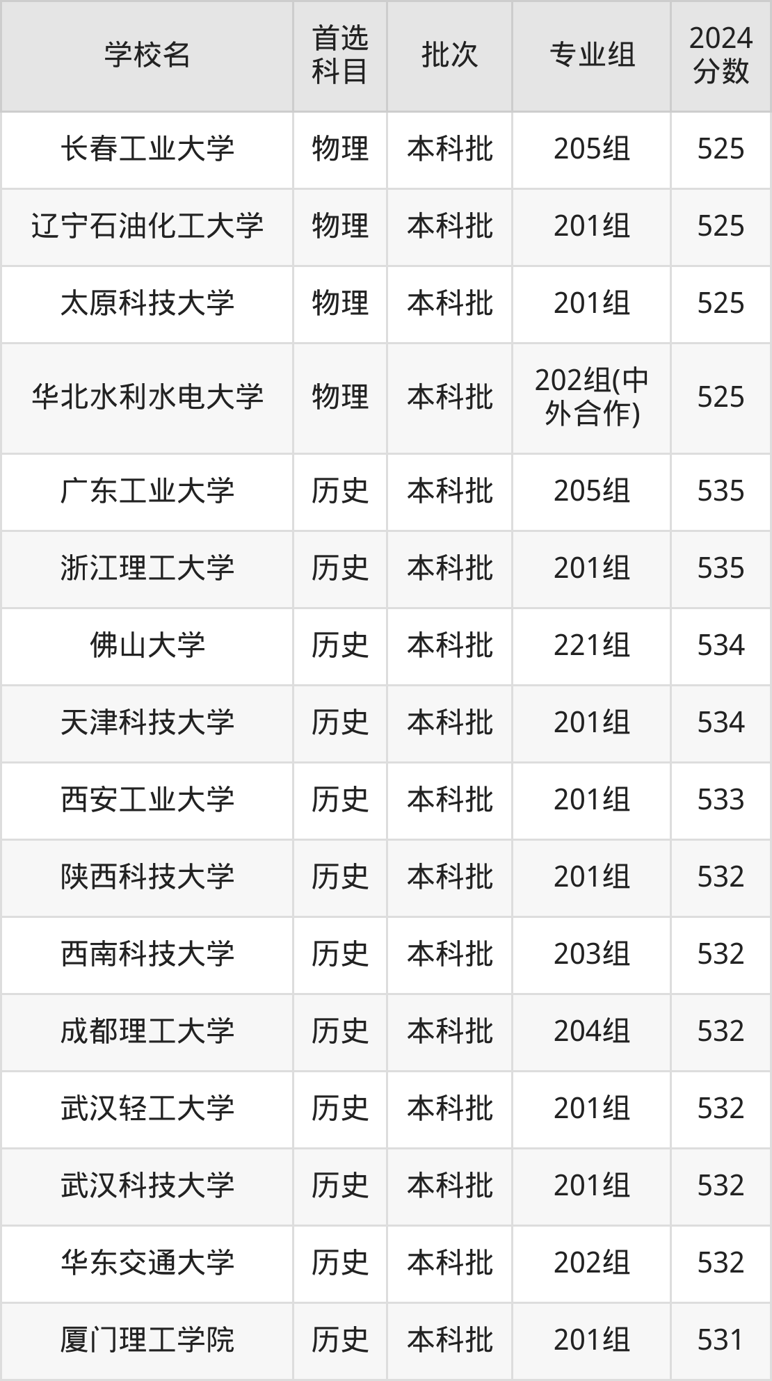 首选历史科目考生能上的有24所,全部在本科批次录取。具体有:广东工业大学205组(535分)、浙江理工大学201组(535分)、佛山大学221组(534分)、天津科技大学201组(534分)等。