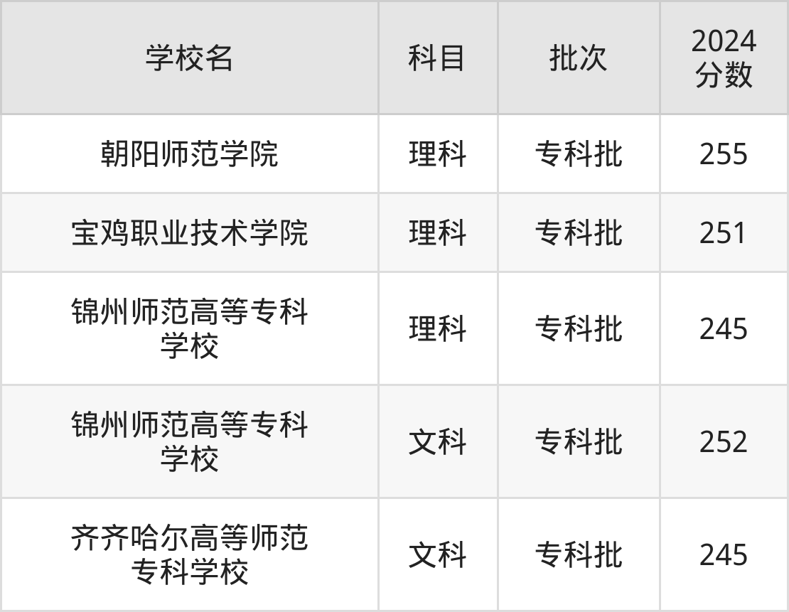 文科科目考生能上的有2所,全部在专科批次录取。具体有:锦州师范高等专科学校(252分)、齐齐哈尔高等师范专科学校(245分)。