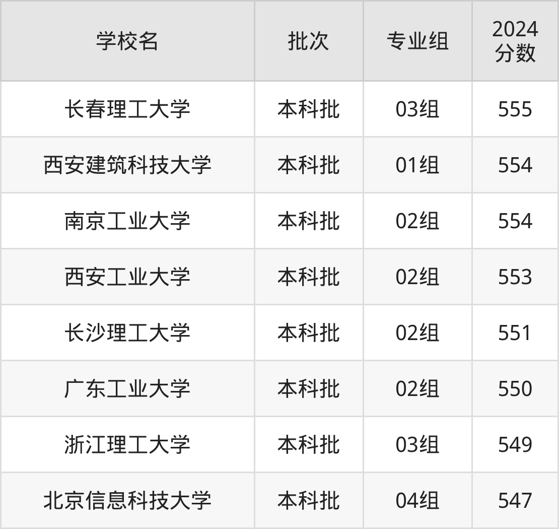 考生能上的有8所,全部在本科批次录取。具体有:长春理工大学03组(555分)、西安建筑科技大学01组(554分)、南京工业大学02组(554分)、西安工业大学02组(553分)等。